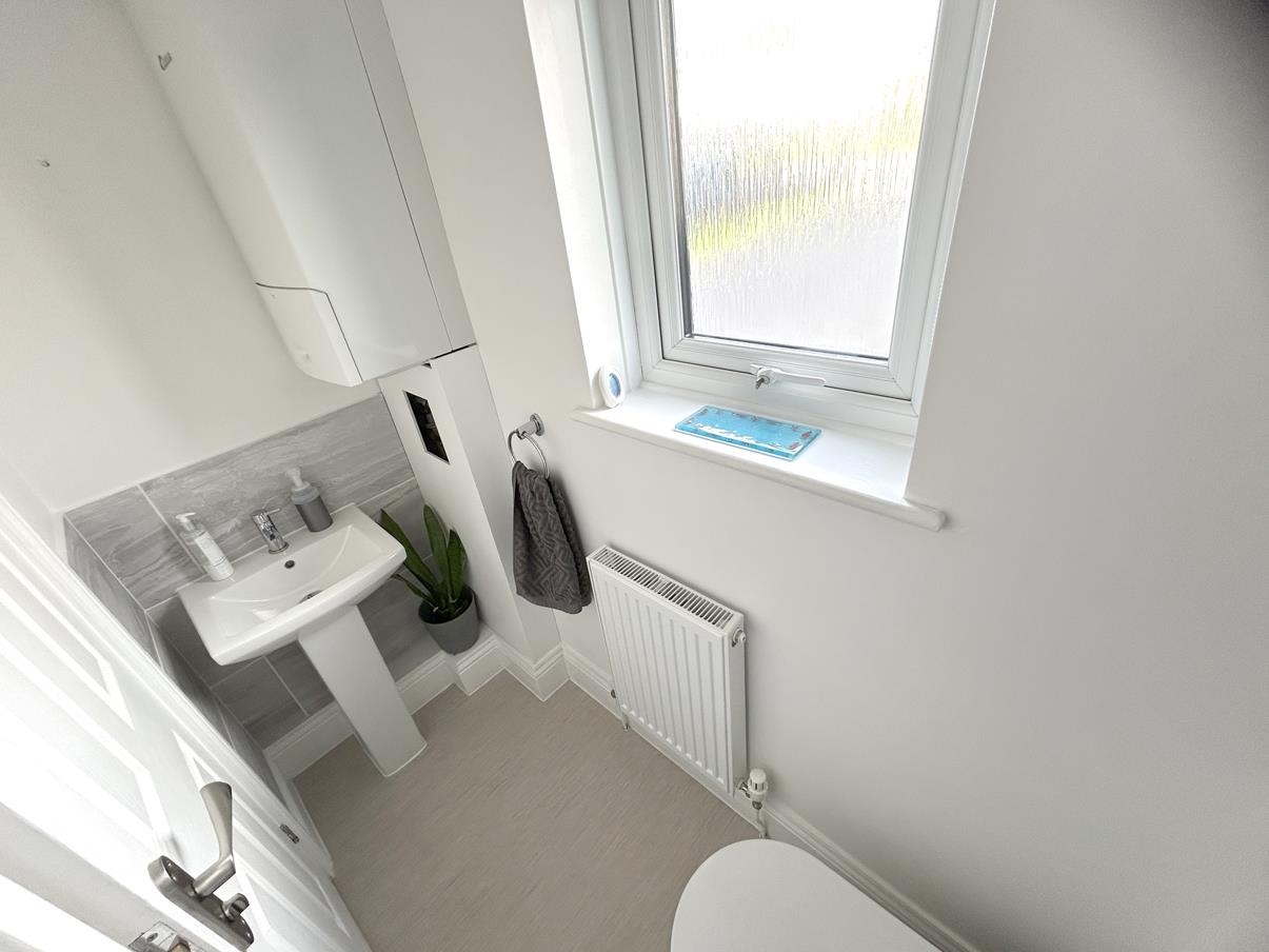 Cloakroom - Having a white low-level w.c, pedestal wash hand basin with tiled surround, electric consumer unit, a wall mounted Worcester gas fired boiler, vinyl flooring and an obscure glazed window to the front.