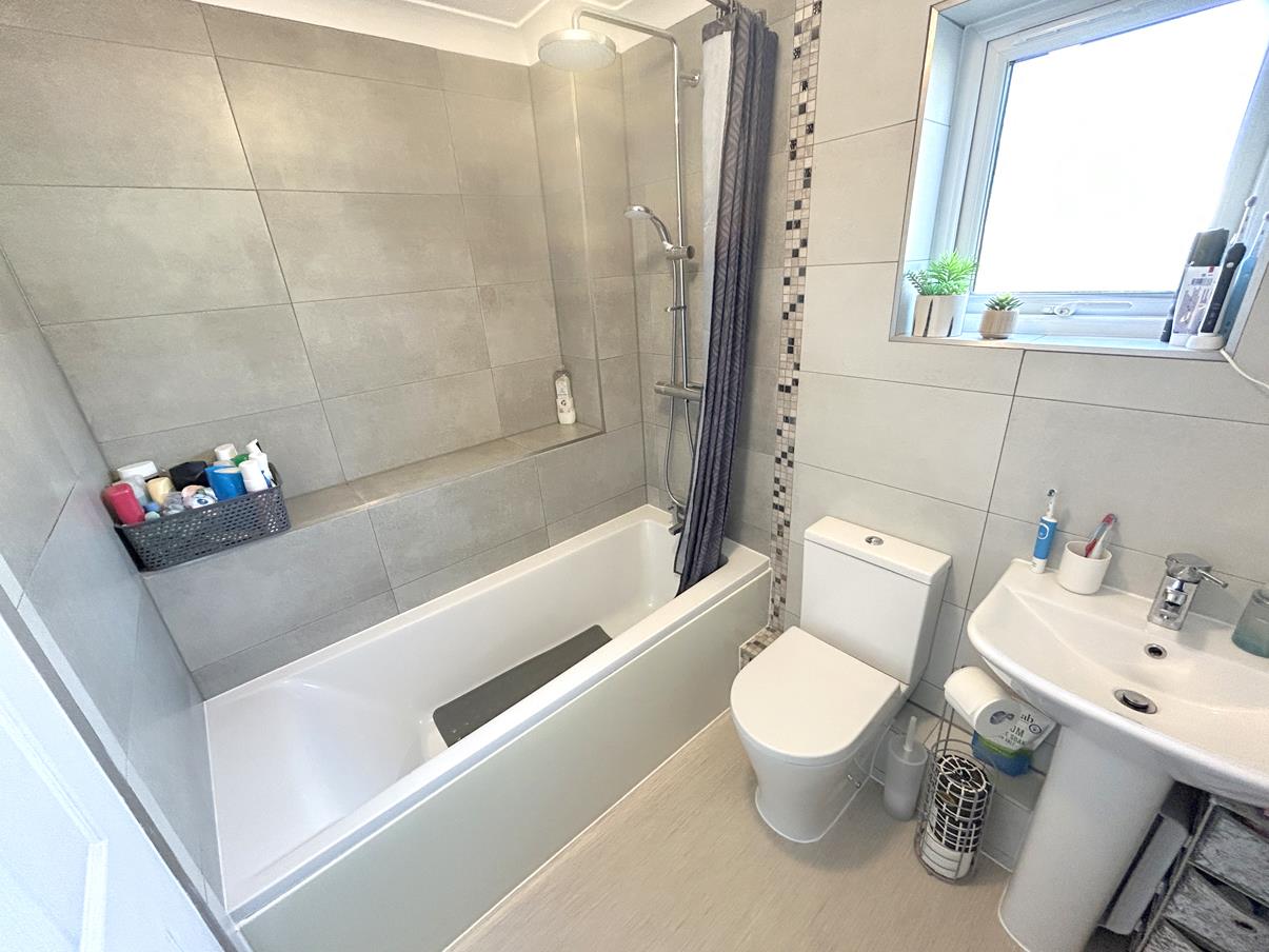 Bathroom - Comprising a white suite with low-level w.c, pedestal wash hand basin with mixer tap over and a white panelled bath with a tiled surround and bespoke shelf, housing a thermostatic shower with attachment and rainforest style drencher head. The room is complimented by attractive tiling to the walls, a chrome ladder style towel rail, vinyl flooring, a shaving point / light and an obscure glazed window to the front.