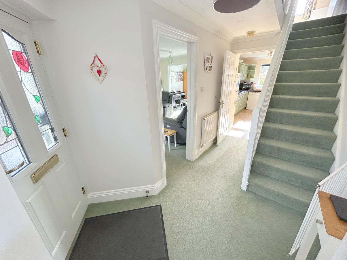 Entrance Hallway - Generously sized with opening to staircase, door to understairs storage cupboard and door to further cupboard with coat hanging rail and shelf over. Doors to lounge/dining room, kitchen and door to