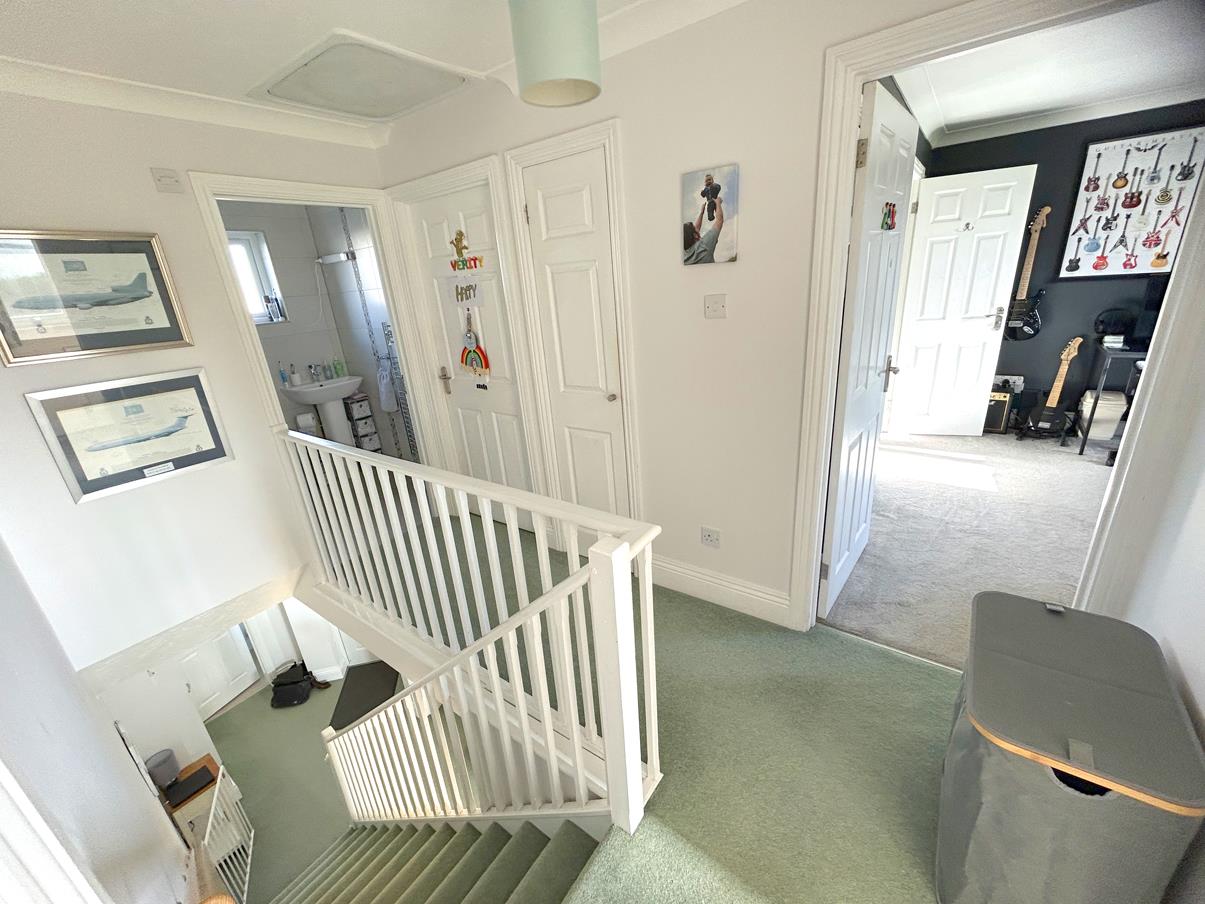 Landing - With white wooden balustrade, door to airing cupboard with shelving, loft hatch to roof space and doors off to all four bedrooms and the family bathroom.