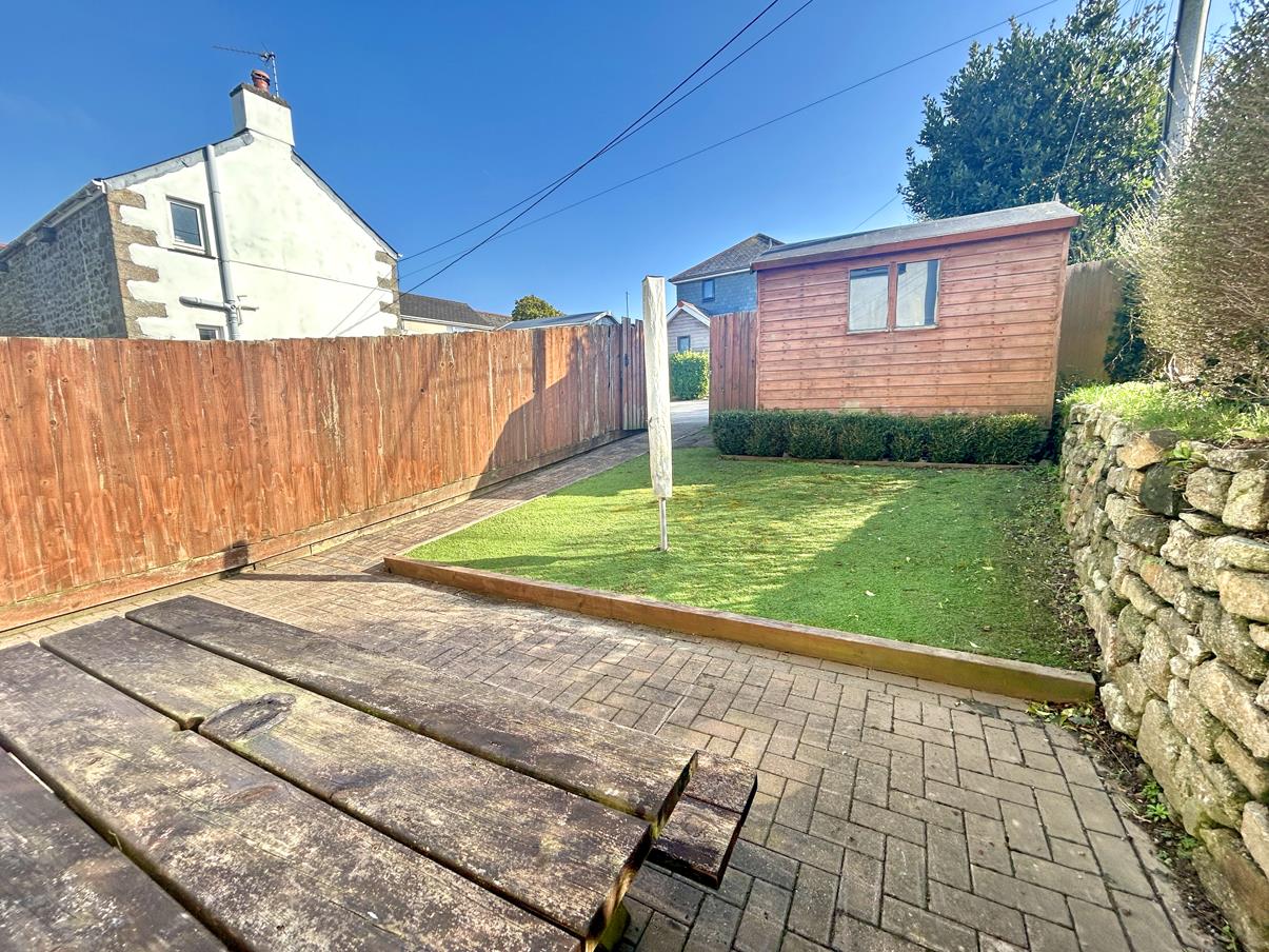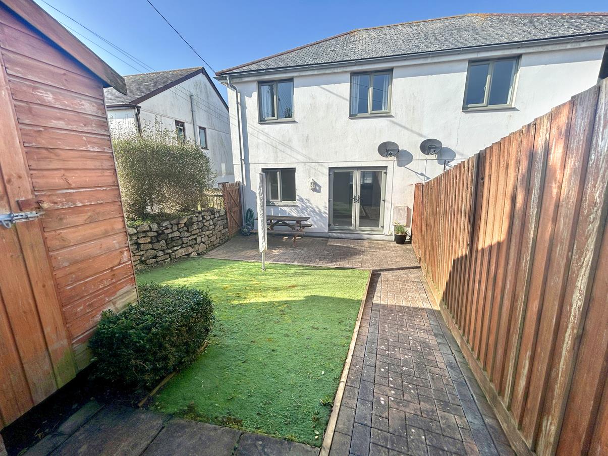 Rear Garden - The rear garden is nicely enclosed by a combination of fencing and an attractive traditional Cornish stone wall, providing both privacy and character. A brick-paved patio creates an ideal seating area for outdoor dining and relaxation, complemented by a low-maintenance artificial lawn. There is also a useful garden shed for storage. Glazed patio doors provide direct access back into the lounge, and a further gate leads along the side of the property, offering additional pedestrian access to the rear. The garden also benefits from an outside light and a water tap for added convenience.
