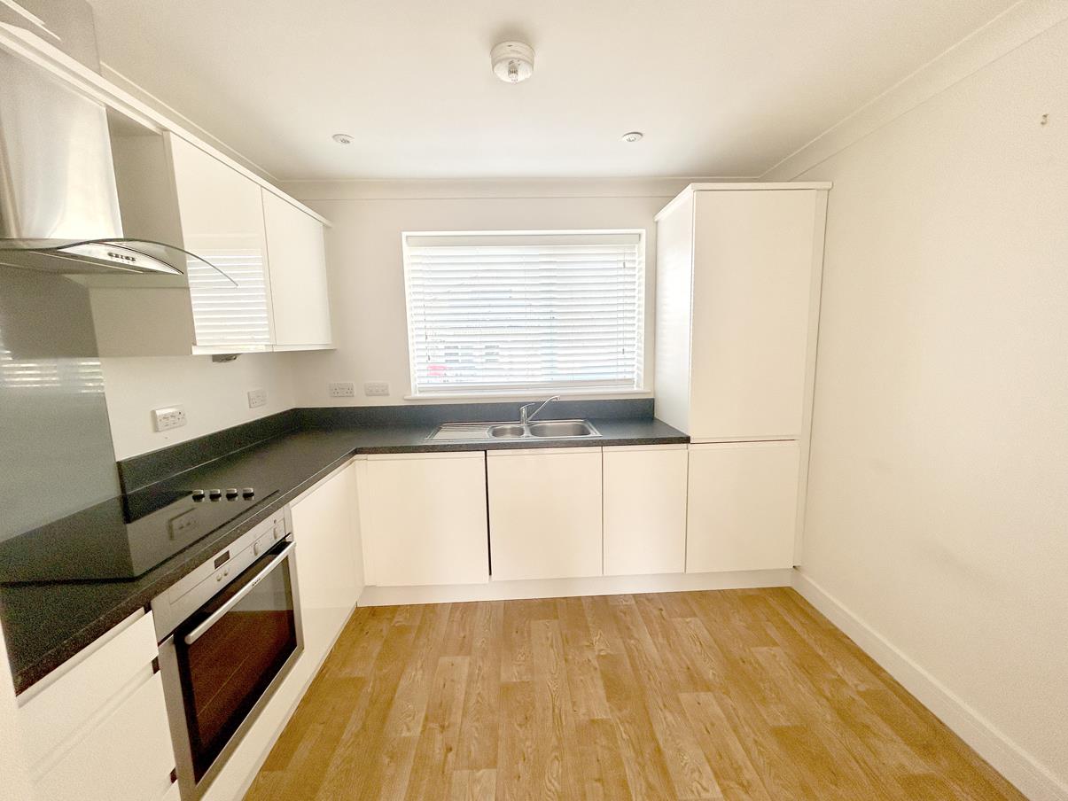 Kitchen Area - 2.96 x 2.34 (9'8" x 7'8") - The property features a stylish, high-gloss white fitted kitchen with black granite-effect worktops and matching upstands, creating a sleek and contemporary finish. A one-and-a-half bowl stainless steel sink with mixer tap is set into the worktop, alongside a ceramic hob by Neff with a glass splashback and a chimney-style extractor hood above. The kitchen offers a good range of storage with a combination of base cupboards, drawers, and wall-mounted units. Integrated appliances include a stainless steel oven, fridge/freezer, built-in microwave, and a slimline dishwasher, all by Neff. A window to the front , while wood-effect LVT flooring and a series of LED downlighters complete the room with a modern and practical finish.