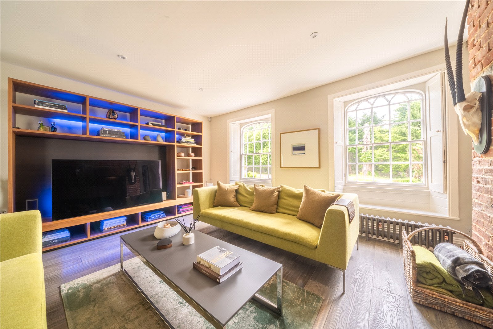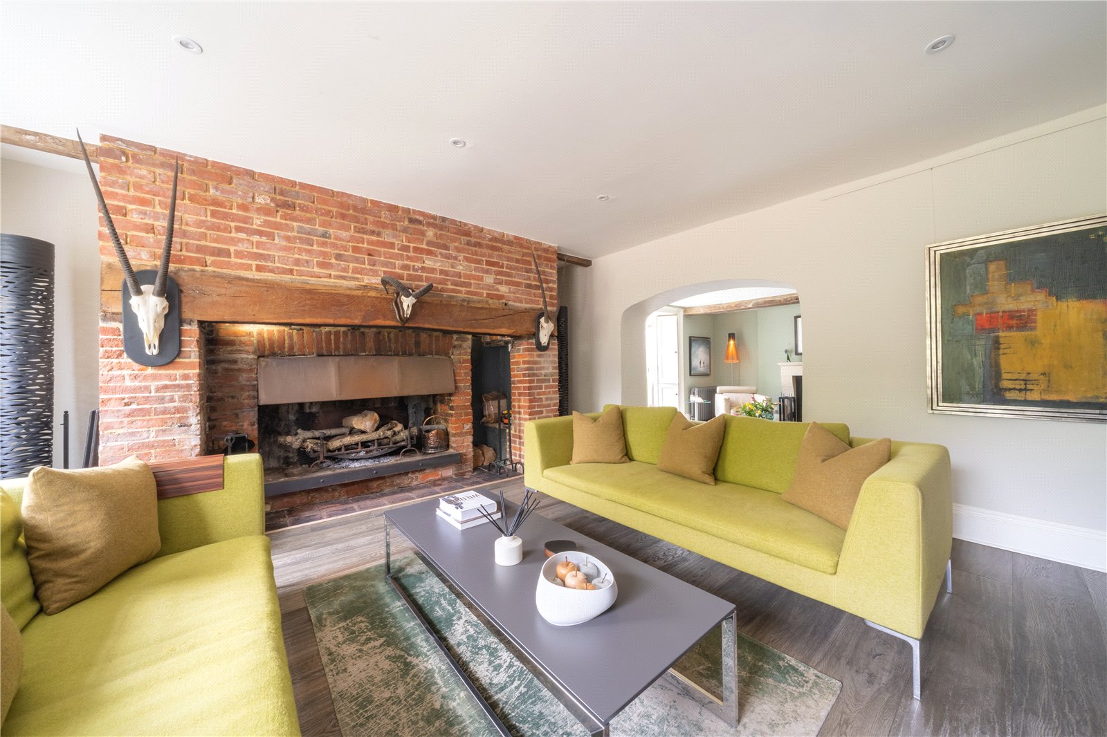 SITTING ROOM: A naturally bright room with a splendid inglenook fireplace with brick surround and substantial oak bressummer beam over, vintage radiators, twin gothic influenced sash windows with wooden internal shutters and window seats, as well as a beautiful aspect over the front landscaped gardens, down lighting, large archway to the adjoining family room / snug.