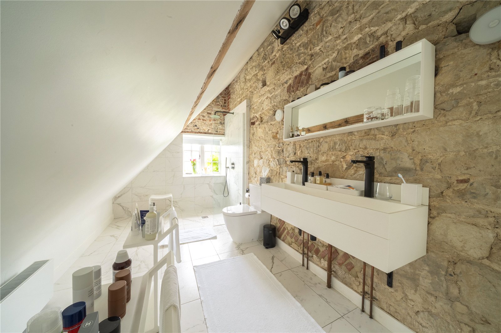 LUXURY ENSUITE SHOWER ROOM: Comprising of attractive tiled floor and matching tiled wall as well as a wonderful feature exposed stone wall, twin feature wash basins with twin mixer taps, fitted recessed mirror, WC, large shower with heavy glazed side, shower system, radiator, beamed ceiling, paned window with wonderful views.