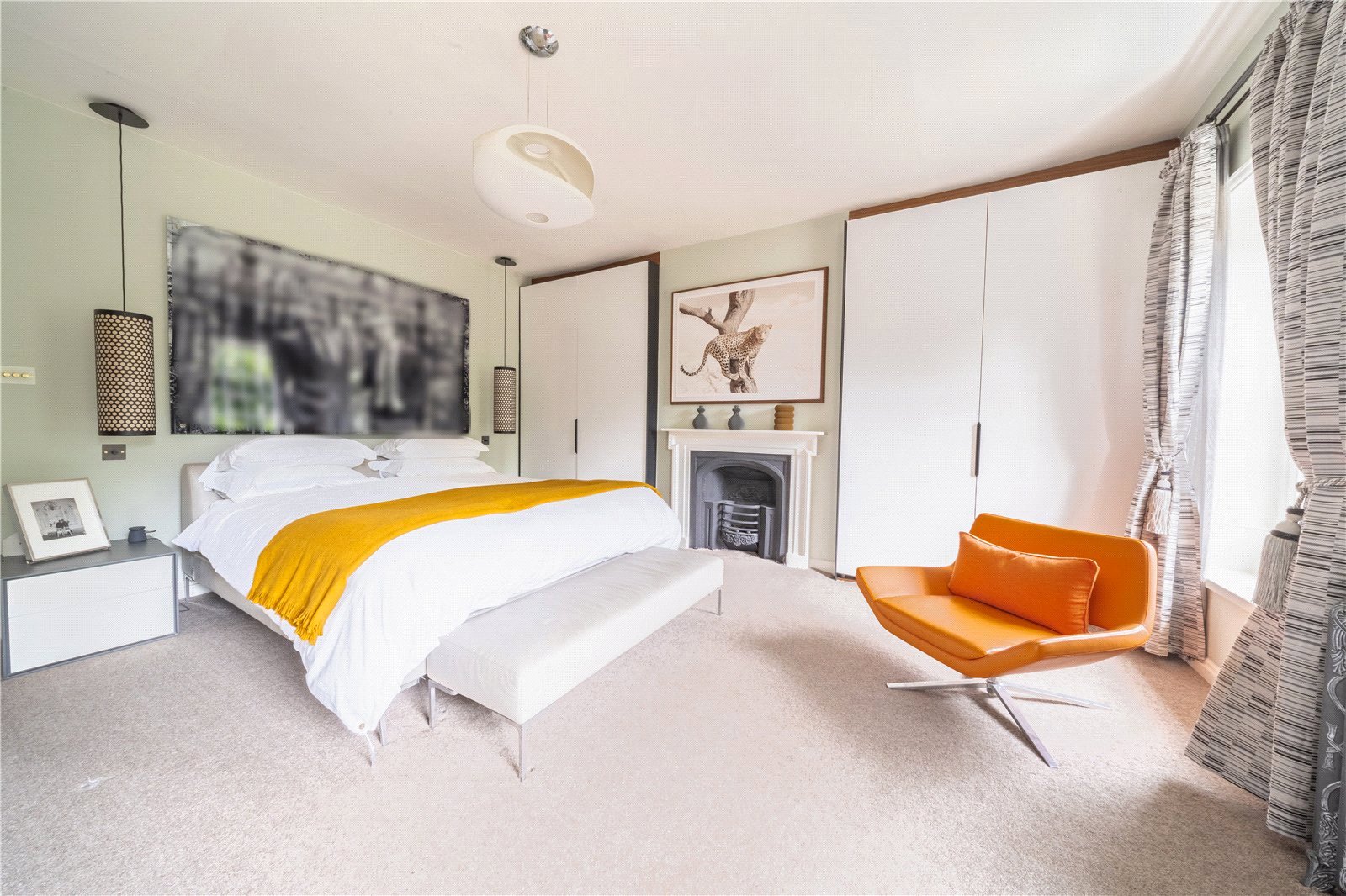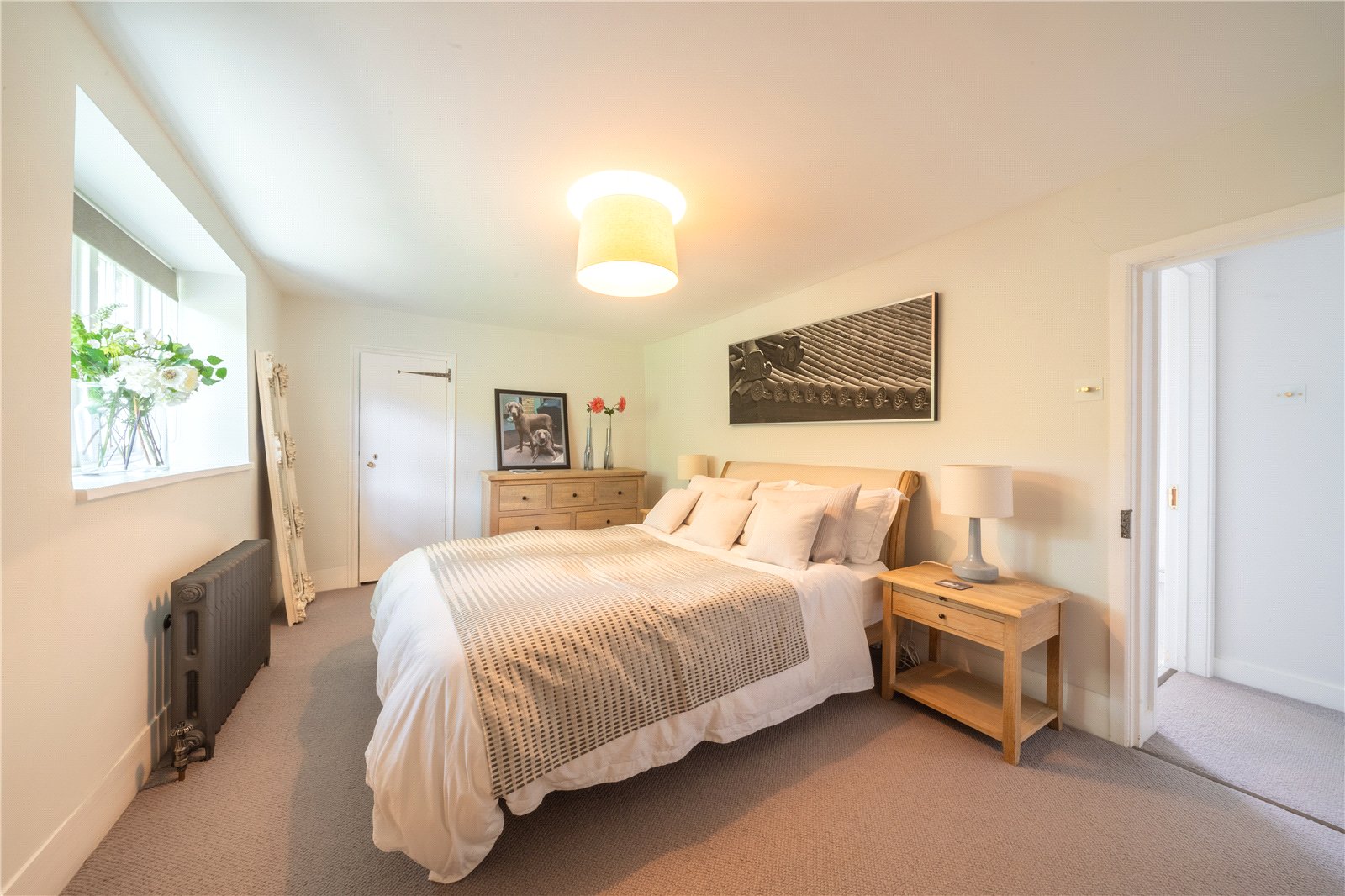 BEDROOM ONE WITH LUXURY ENSUITE SHOWER ROOM: Comprising of a large double sized bedroom with a character cast iron feature fireplace, twin fitted wardrobes vintage radiator, twin fitted sash windows with aspect over the landscaped gardens, door to ensuite luxury shower room.