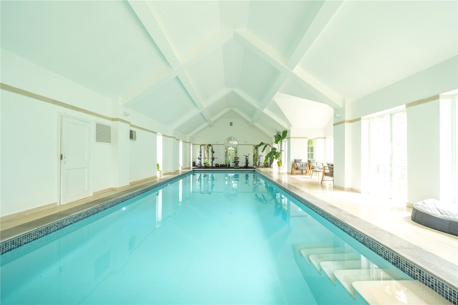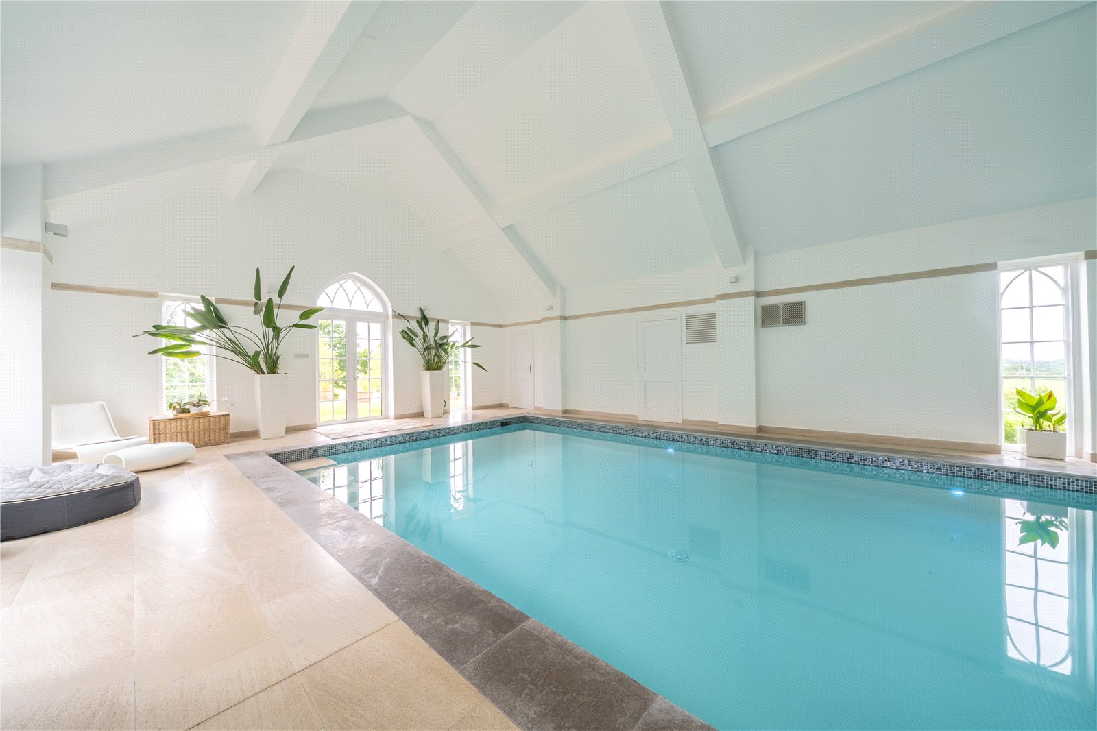 POOL BUILDING: This is of a generous size and attractive design and within it has a large heated swimming pool, with several doors opening out to the grounds and benefitting from amazing far-reaching views to the South Downs. There is also a WC, a changing room and steam room / shower room.