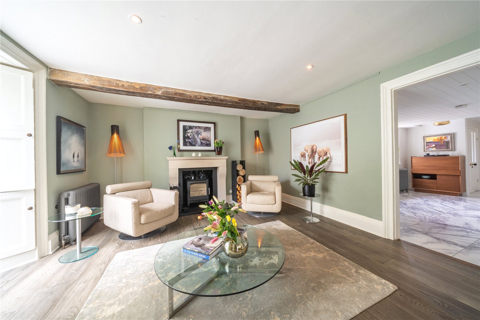 FAMILY ROOM / SNUG: Also benefitting form a feature fireplace with a stone surround and mantle as well as a fitted wood burner, down lighting and feature character beam to ceiling, vintage radiator, twin panelled and paned glazed character doors leading to a large conservatory / orangery.