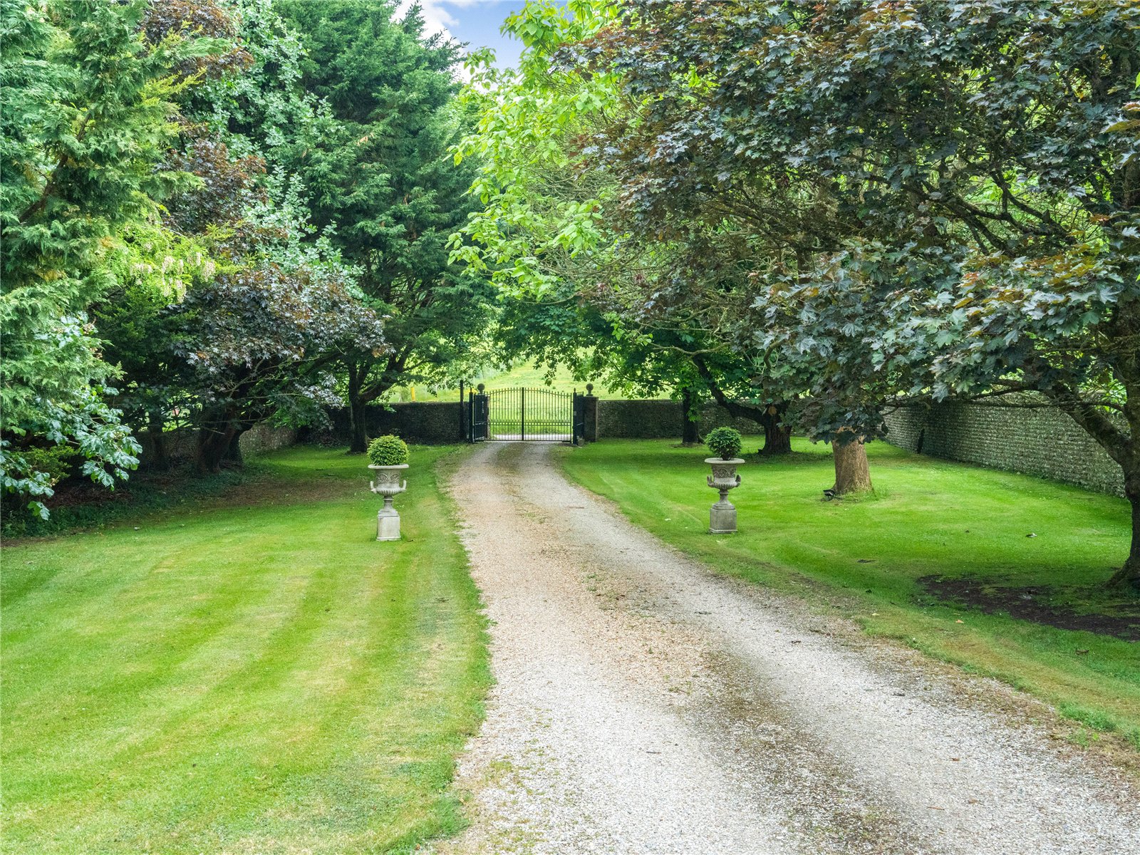DRIVEWAY: This is approached off a quiet country lane through electrically operated meatal gates, which comprises of a gravel driveway with and lawns and trees lined either side and which widens into a generous turning and parking areas, with the driveway then continuing past the pool building and to the garage complex.