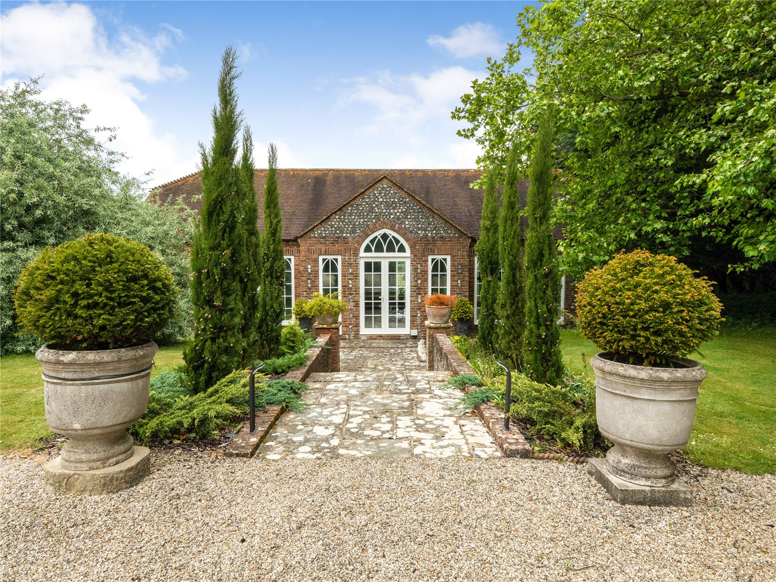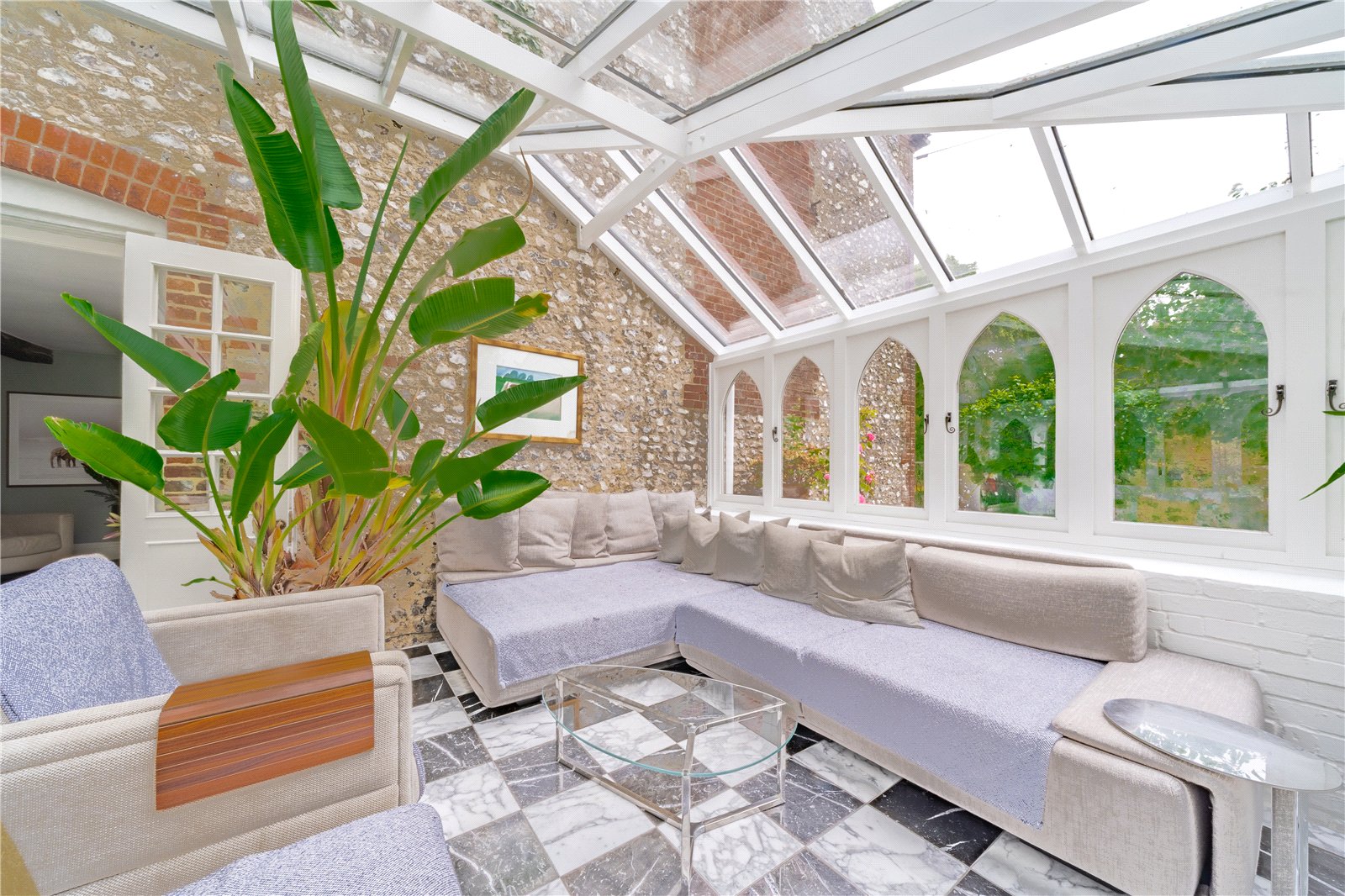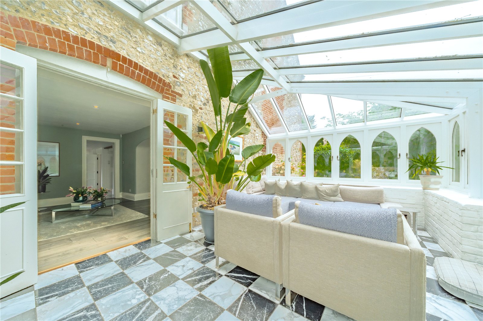 ORANGERY / CONSERVATORY: Comprising of attractive chequered marble floor, vintage radiators, low painted brick walls with gothic influenced wooden framed and double glazed upper framed sides, as well as a vaulted wooden and double-glazed ceiling, in addition to three sets of gothic influenced French double glazed doors opening out to the elegant landscaped gardens.