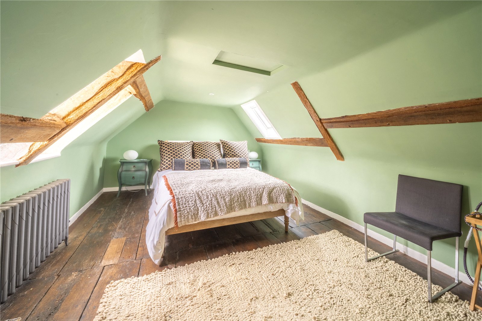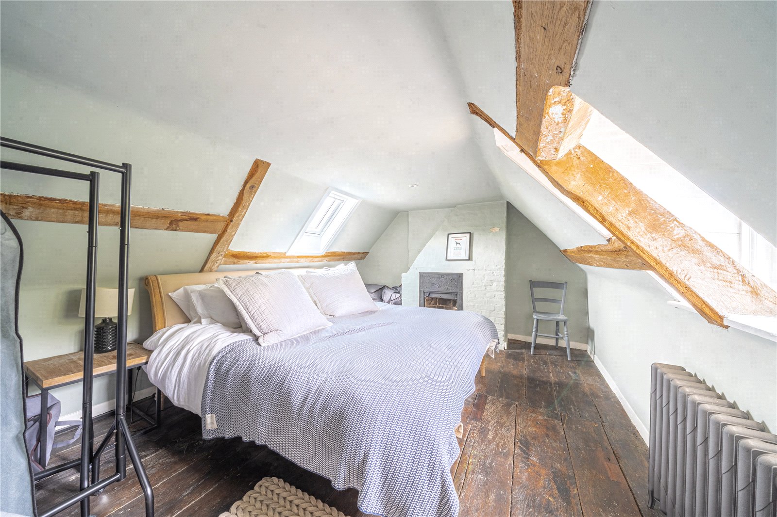 BEDROOM FIIVE: A double sized room with beamed walls and wooden floors vintage radiators, paned windows with aspect