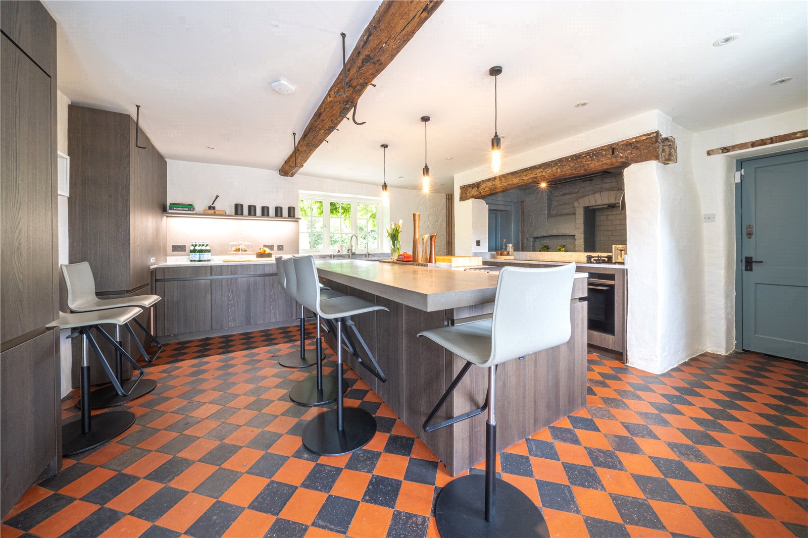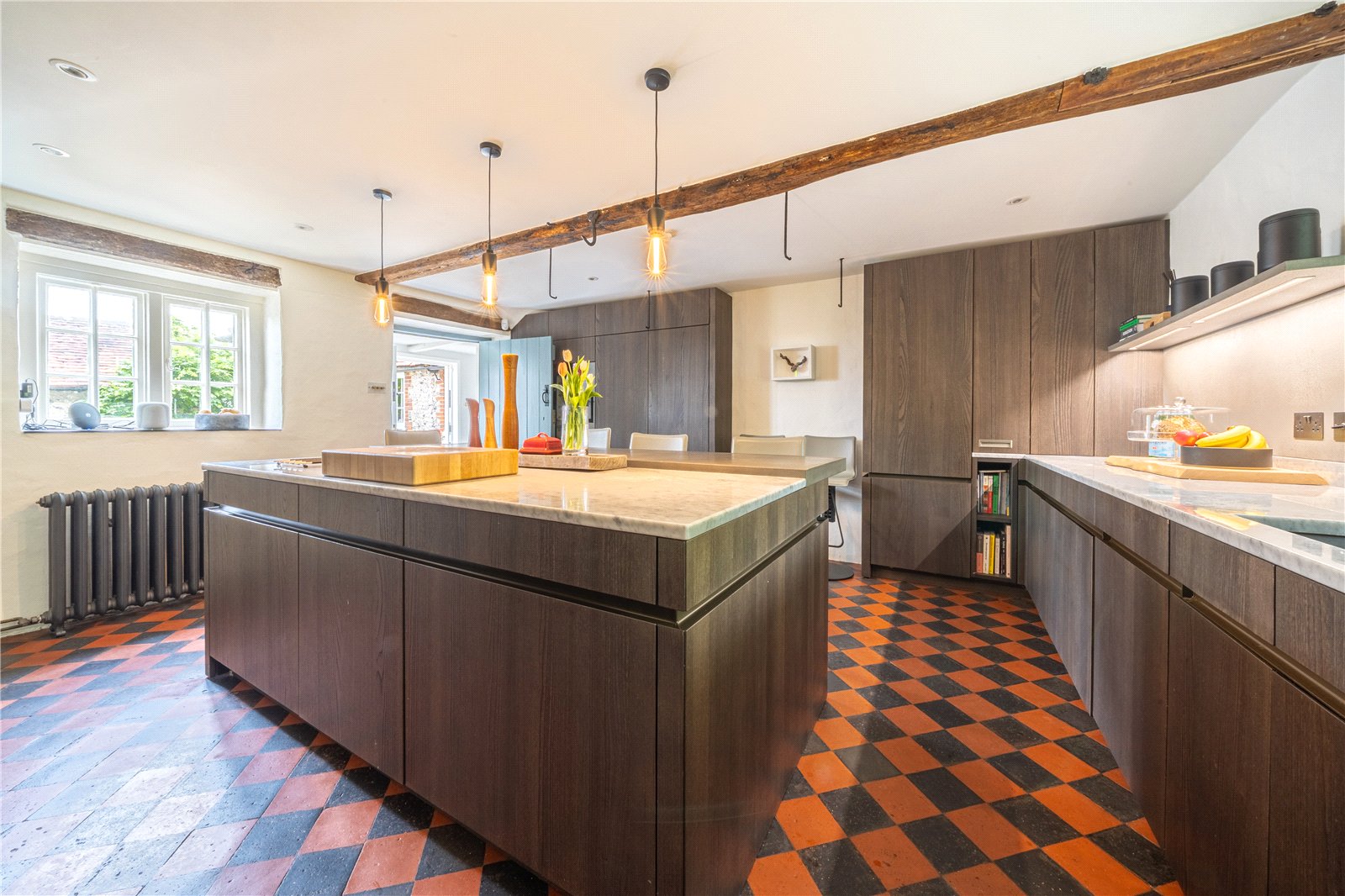 LUXURY KITCHEN / BREAKFAST ROOM: Comprising of beautiful chequered quarry tiled floor, extensive range of modern Italian style cupboard and base units with marble worksurfaces over, further feature central island with further matching units with marble preparation surface over, as well as a polished concrete breakfast bar, triple oven range area, with gas and ceramic electric hob over, marble worktops and brick surround with oak bressummer beam over, vintage radiator, inset sink with mixer tap, down lighting, feature character beam to ceiling, further feature ceiling lights above breakfast bar, integrated wine cooler, integrated fridge and freezer, integrated dishwasher, windows to exterior landscaped grounds, door to walk in larger, with fitted shelving and quarry tiled floors, window with views of grounds. Door to adjoining rear lobby / utility room.