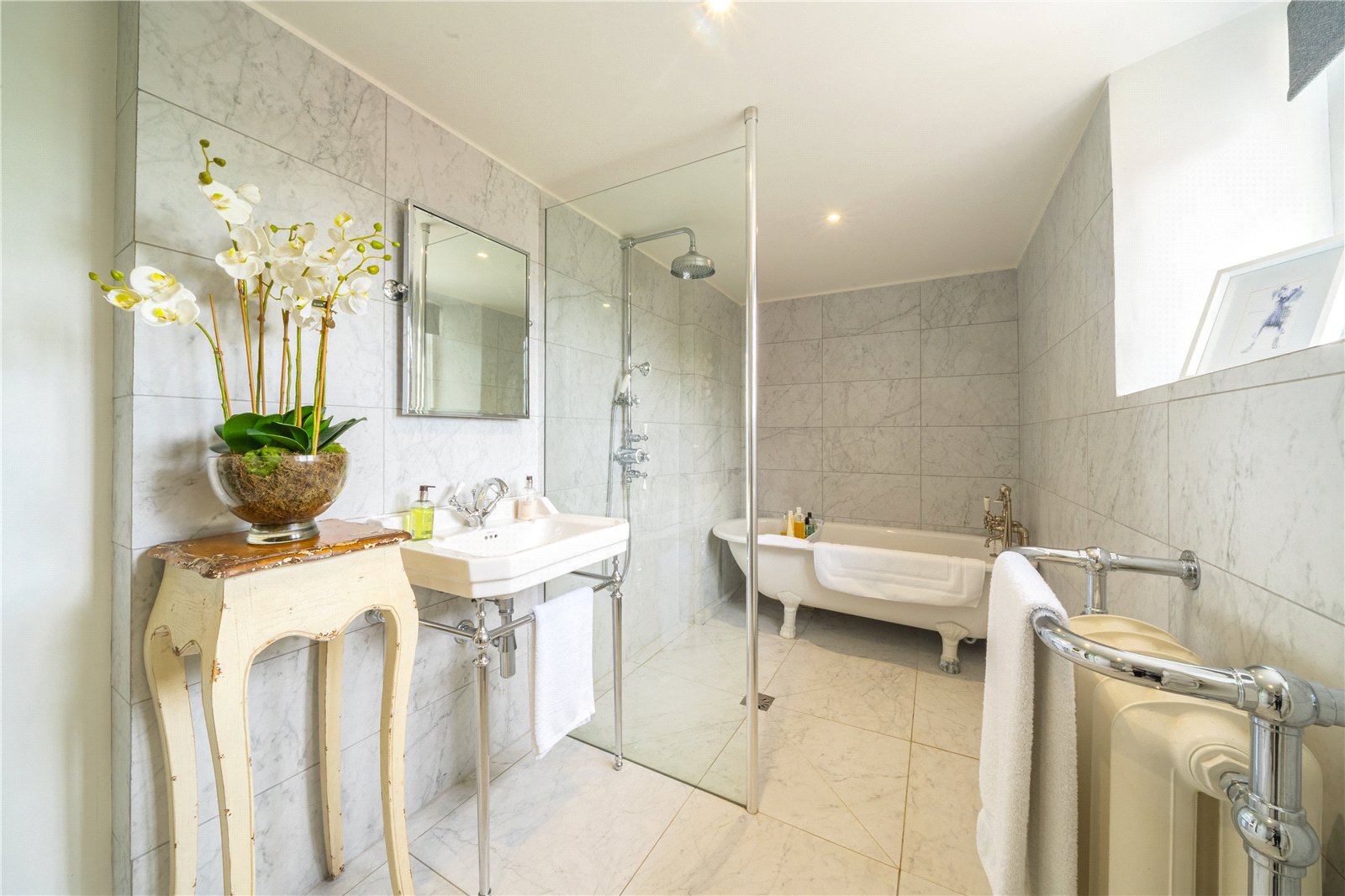 FAMILY BATHROOM / SHOWER ROOM: Comprising of with chrome heated towel rail and vintage radiator, wash basin with chrome mixer tap, tiled walls and floors, WC, roll top bath, further wet room shower area with heavy glazed, paned window.