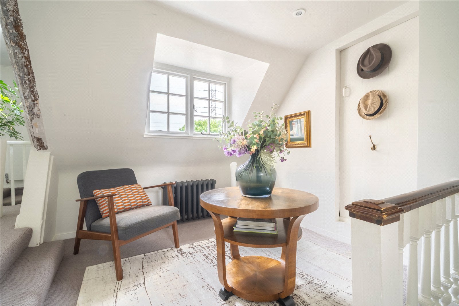 SECOND FLOOR LANDING: Comprising of beautiful exposed character wooden floors, vintage style radiator, balustraded galleried area, vintage radiator, paned windows with stunning rural views, doors leading off in either direction to bedrooms four and five.