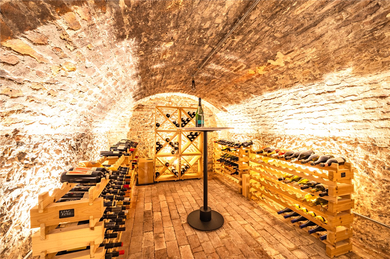 CELLAR: Approached by a door from the main hall and leads down to the two-room cellar with a storage room and a wine area with brick floor and brick ceiling.