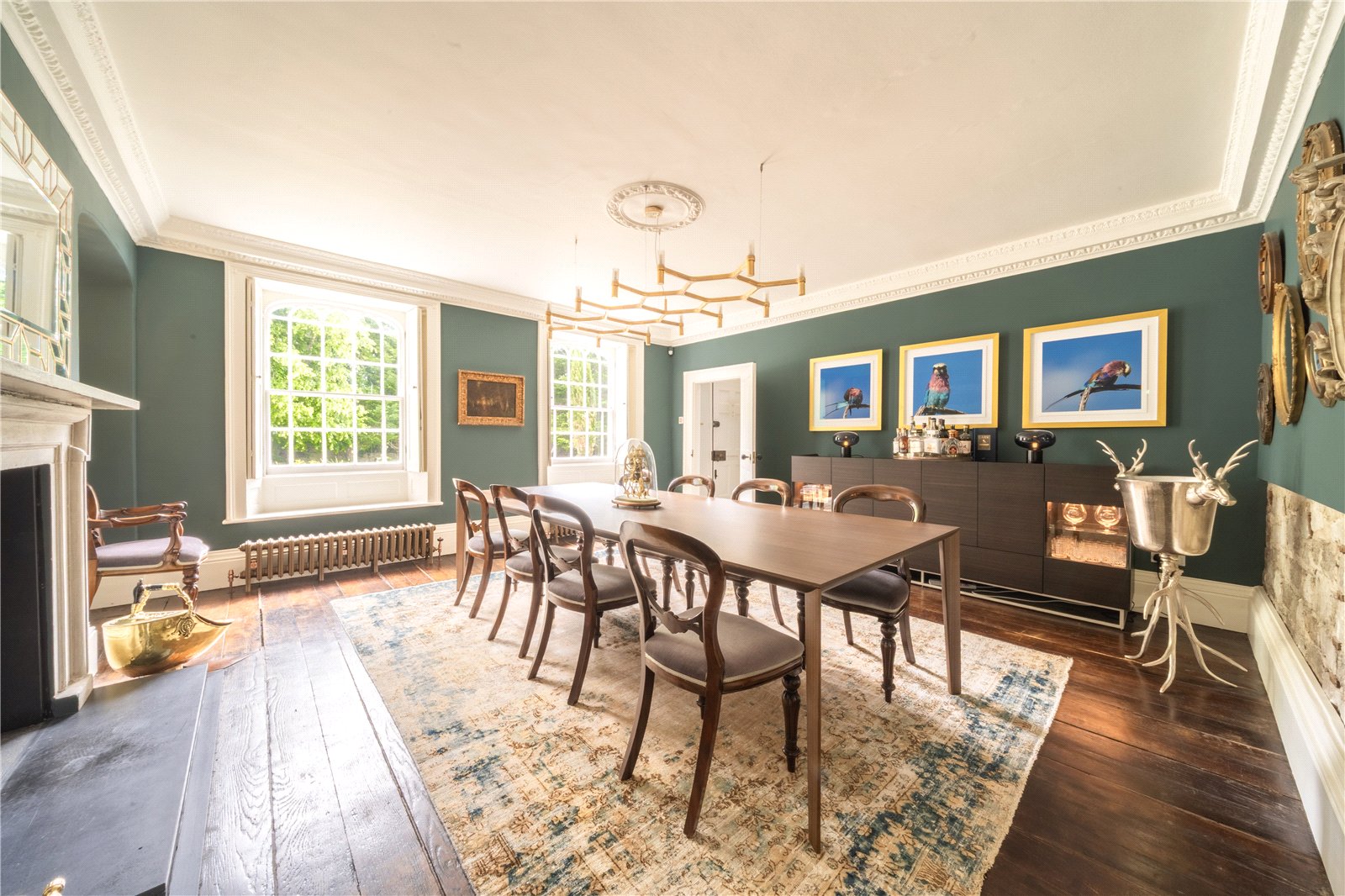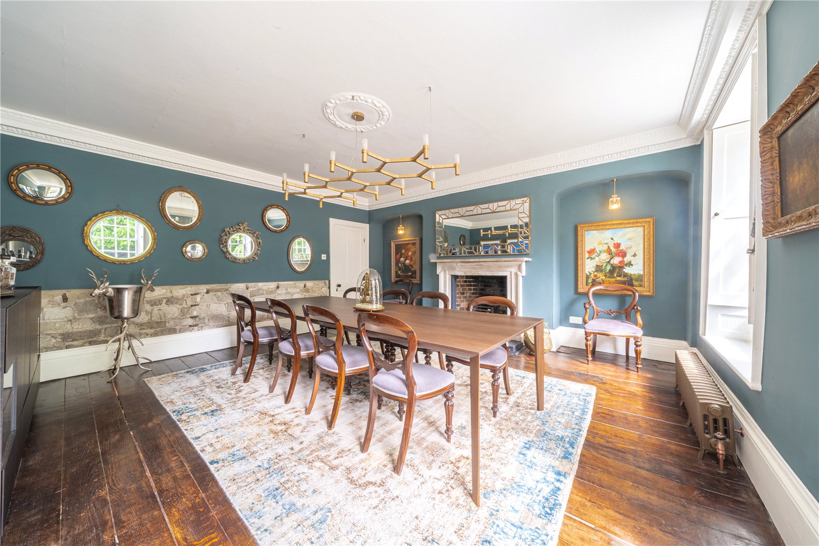 FORMAL DINING ROOM: Comprising of wonderful polished character wooden floors, with vintage radiators, exquisite moulded coved ceiling, feature open fireplace with character surround, twin sash windows with internal shuttering and incorporated window seats, part exposed stone wall, central feature ceiling light, further door leading back to the hall.