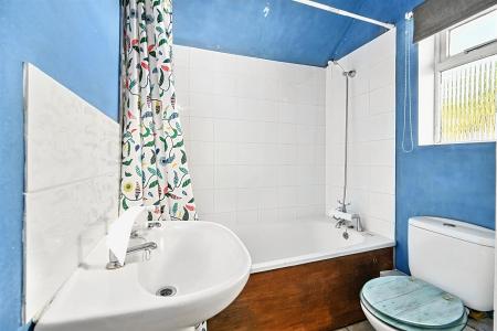 Stairs from the living room rise to the first floor where there are three bedrooms and a family bathroom with shower over bath.