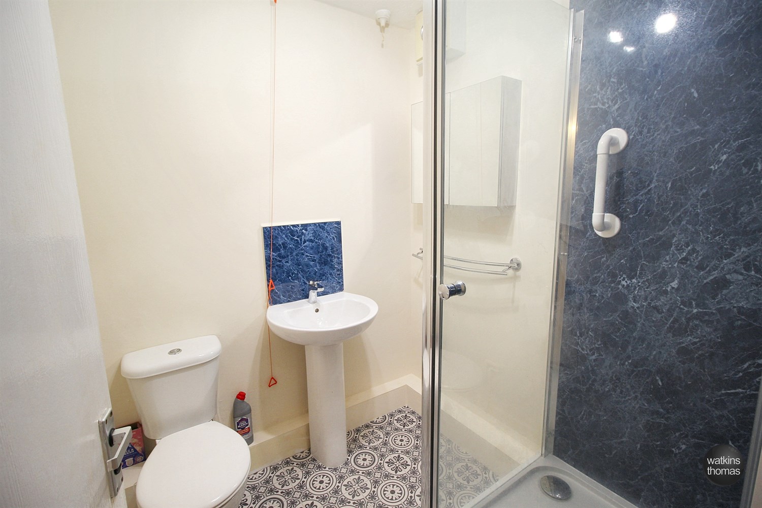 With shower cubicle and electric shower, shower boarded surround, pedestal mounted wash hand basin, low flush WC, extractor fan and vinyl flooring.