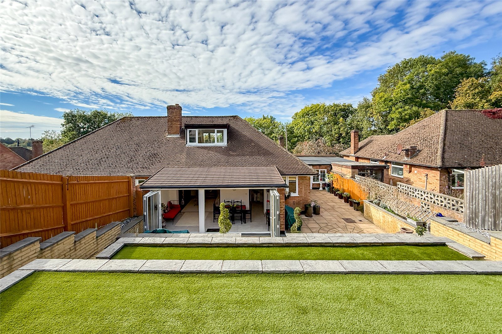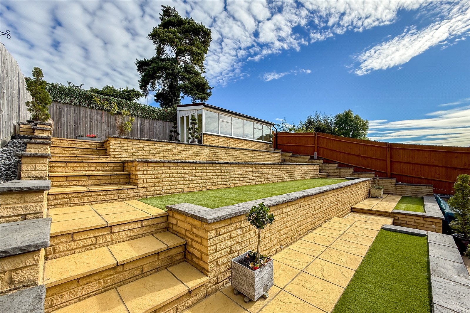 The tiered rear garden is a real highlight, designed across multiple levels of paving and artificial grass to create both practicality and style. A patio terrace is ideal for al fresco dining, with further terraces providing room for planting, entertaining, or simply relaxing outdoors. At the top of the garden sits a versatile office/studio, perfect for home working, fitness or creative use.