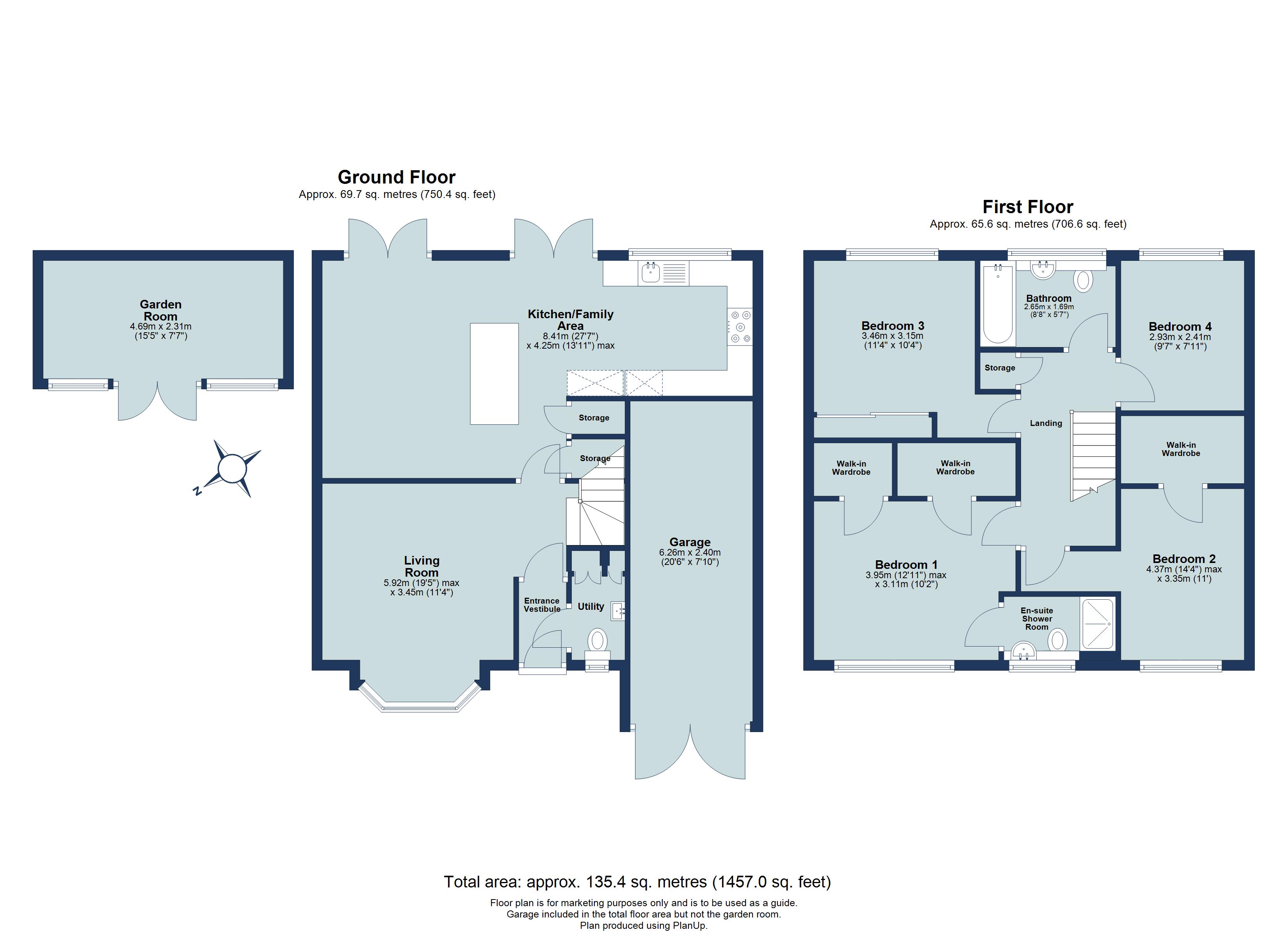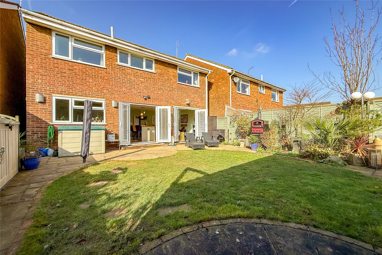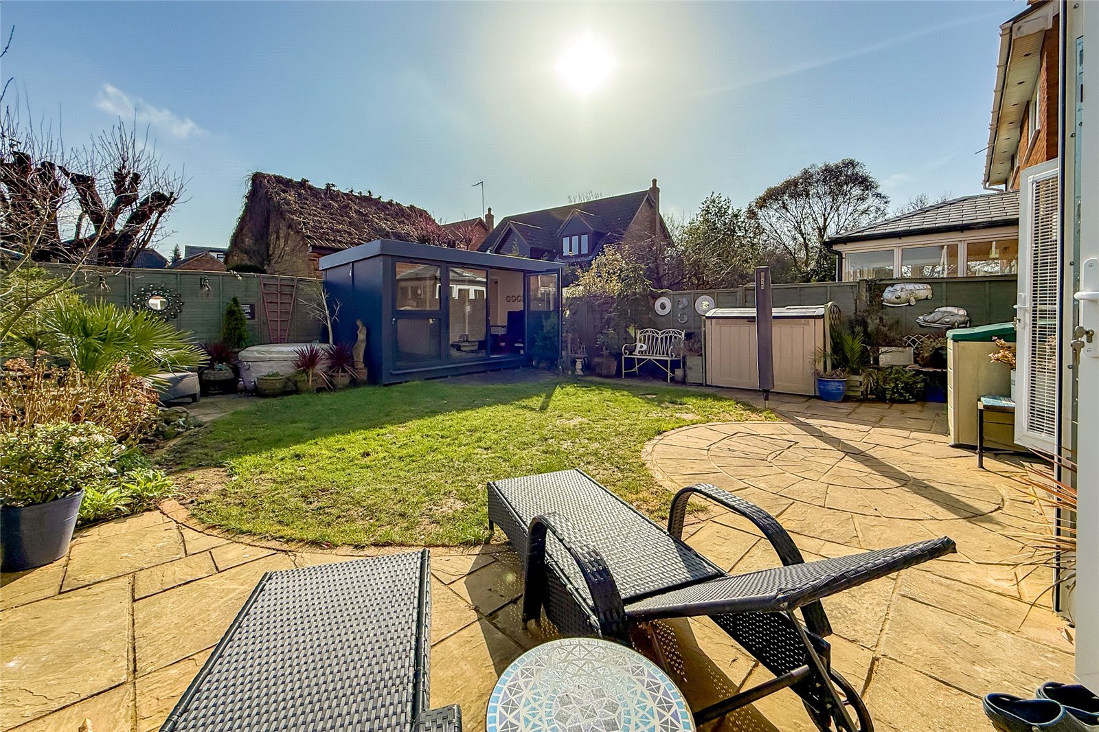 To the rear, the standout feature of the home is the superb open-plan kitchen/dining/family room. Thoughtfully designed as the heart of the house, this expansive area offers clearly defined yet sociable zones for cooking, dining and everyday family life. Two sets of doors open directly onto the garden, allowing natural light to flood the space and creating a seamless connection between indoor and outdoor living during the warmer months.Stairs rise to a generous first-floor landing, giving access to four well-proportioned bedrooms and a modern family bathroom. Bedrooms one and two both enjoy the luxury of walk-in wardrobes, providing excellent storage, while the principal bedroom further benefits from a stylish en-suite shower room. The remaining bedrooms are ideal for children, guests, or a home office, offering flexibility for growing families or those working from home.Outside, the southeast-facing rear garden is a real highlight. A patio area provides the perfect spot for al fresco dining and summer gatherings, leading onto a lawn bordered by mature flowers and shrubs that create a colourful and private setting. The garden room, currently arranged as a cosy snug, offers excellent versatility and could easily serve as a home office, gym, studio or playroom depending on a buyer's needs.