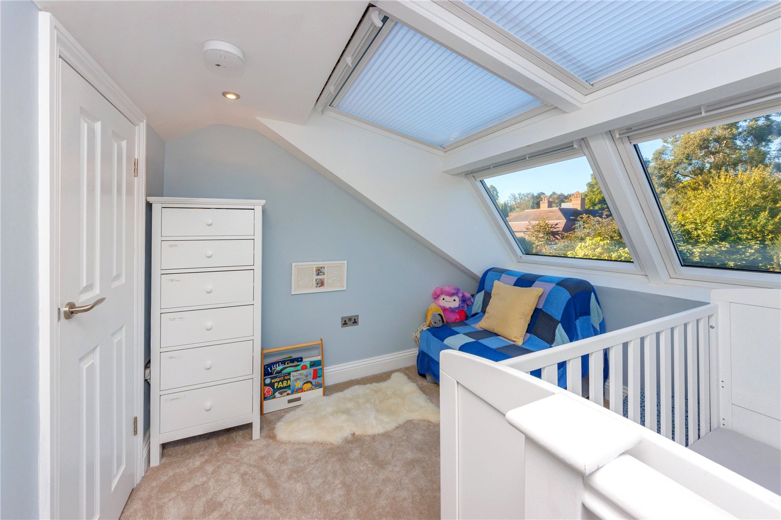 Upstairs, the first-floor hosts two generously sized bedrooms with modern fitted storage, including a main bedroom with an ensuite bathroom and views to the garden. A third bedroom is located on the top floor, using large feature windows to create a uniquely inviting space.