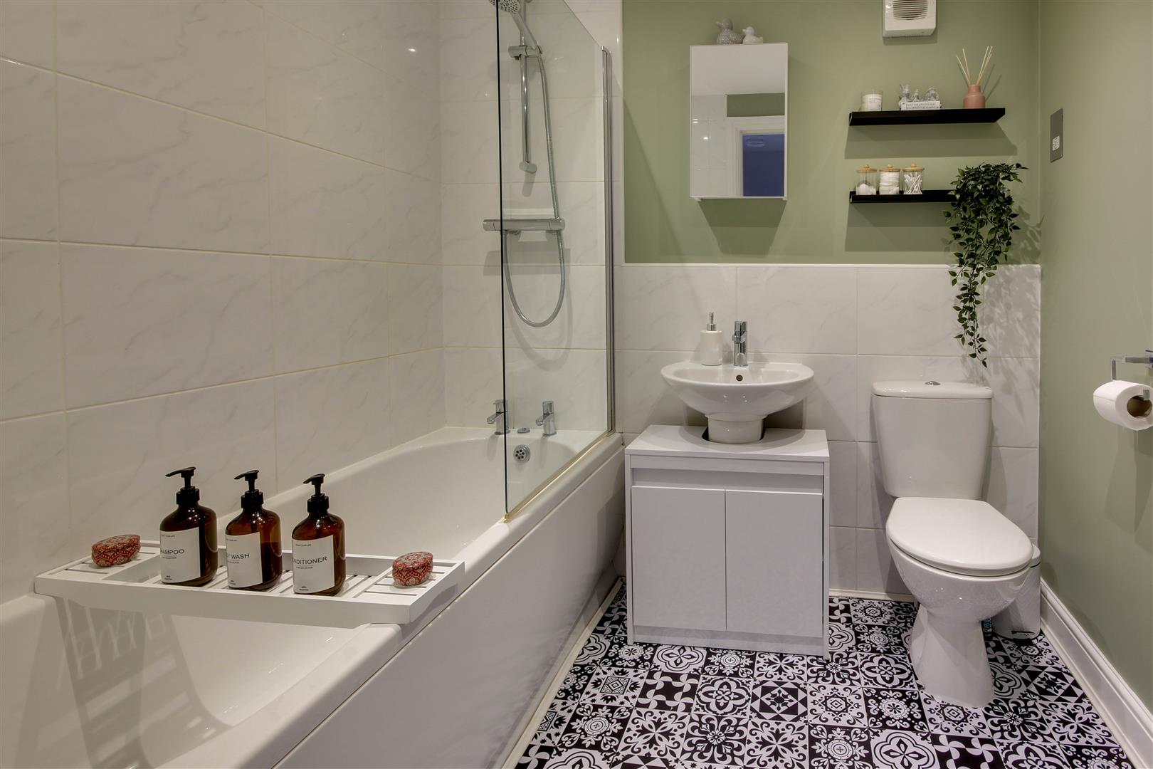 Bathroom - 2.11m x 1.85m approx (6'11" x 6'1" approx) - Bathroom comprising low-flush W.C., wash-hand basin and bath with shower fitting with tiled surround.