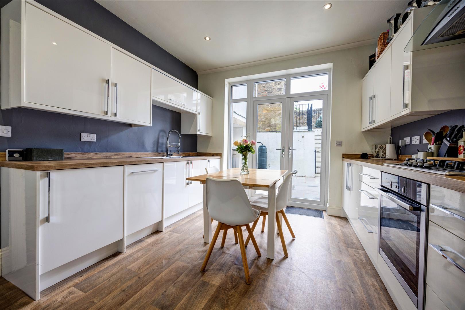 The property is approached via a tidy front yard. Step inside and you're welcomed by an entrance hall with access to a convenient utility room, offering practical space for laundry and storage and a stylish, modern fitted kitchen with double doors opening onto the low-maintenance rear yard. An open-plan layout flows seamlessly into the bright and spacious sitting room, featuring an open fire and a large bay window with original stained glass panels that fills the space with natural light.