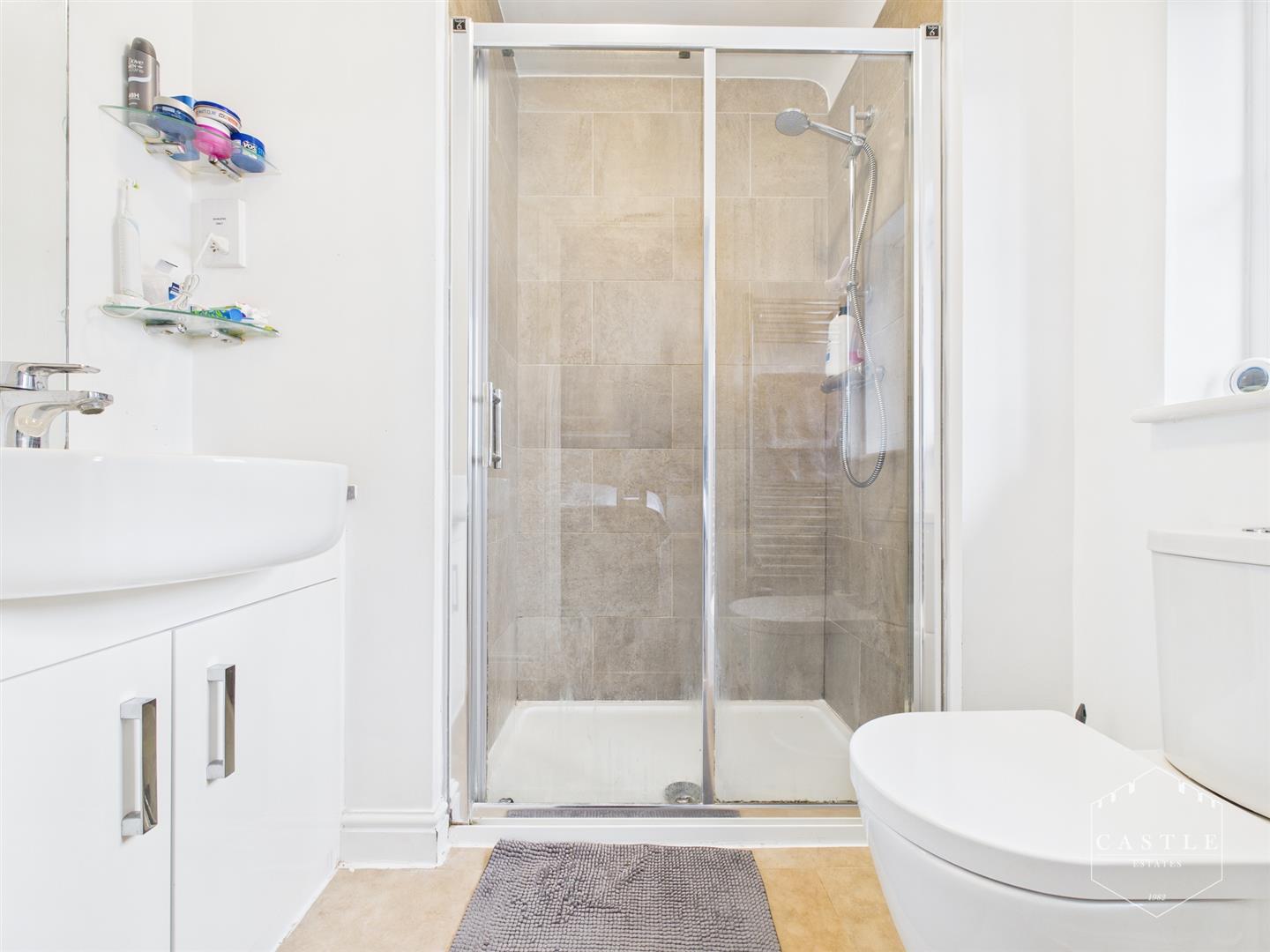 Ensuite Shower Room - 1.97m x 1.68m (6'5" x 5'6" ) - having shower cubicle, low level w.c., vanity unit with wash hand basin, ceramic tiled splashbacks, chrome heated towel rail and upvc double glazed window with obscure glass.