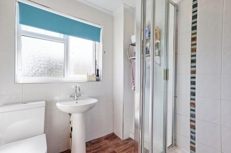 SHOWER ROOM Fitted in a white three piece suite comprising WC wash handbasin and self-contained shower cubicle with plumbed in shower. Tiling to all walls. Cushion flooring. Stainless steel towel rail/radiator. Coved ceiling. Double glazed obscure window to rear.
