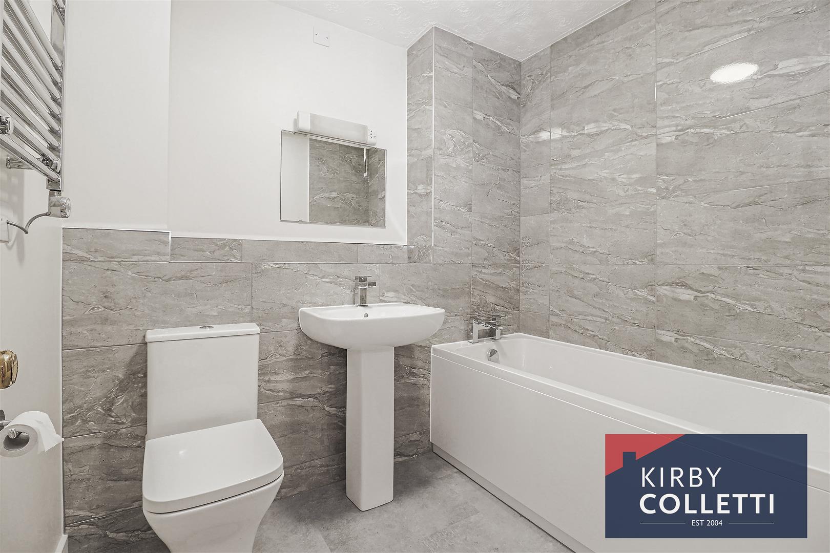 Re-Fitted Bathroom - 2.21m'' x 1.96m'' (7'3'' x 6'5'') - White suite comprising panel enclosed bath mixer tap over. Pedestal wash hand basin. Low level W.C. Partly tiled walls. Extractor fan. Heated towel rail.