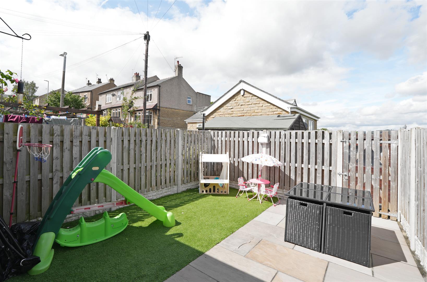 Rear Garden - Enclosed patio and artificial lawn garden.