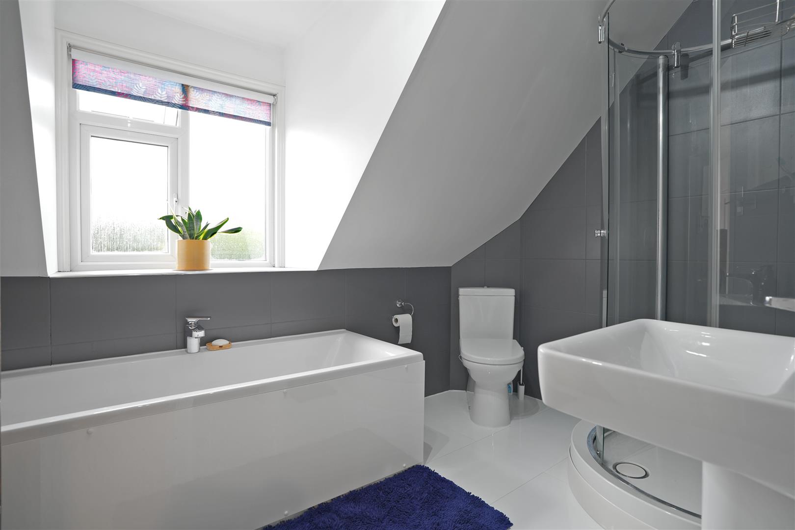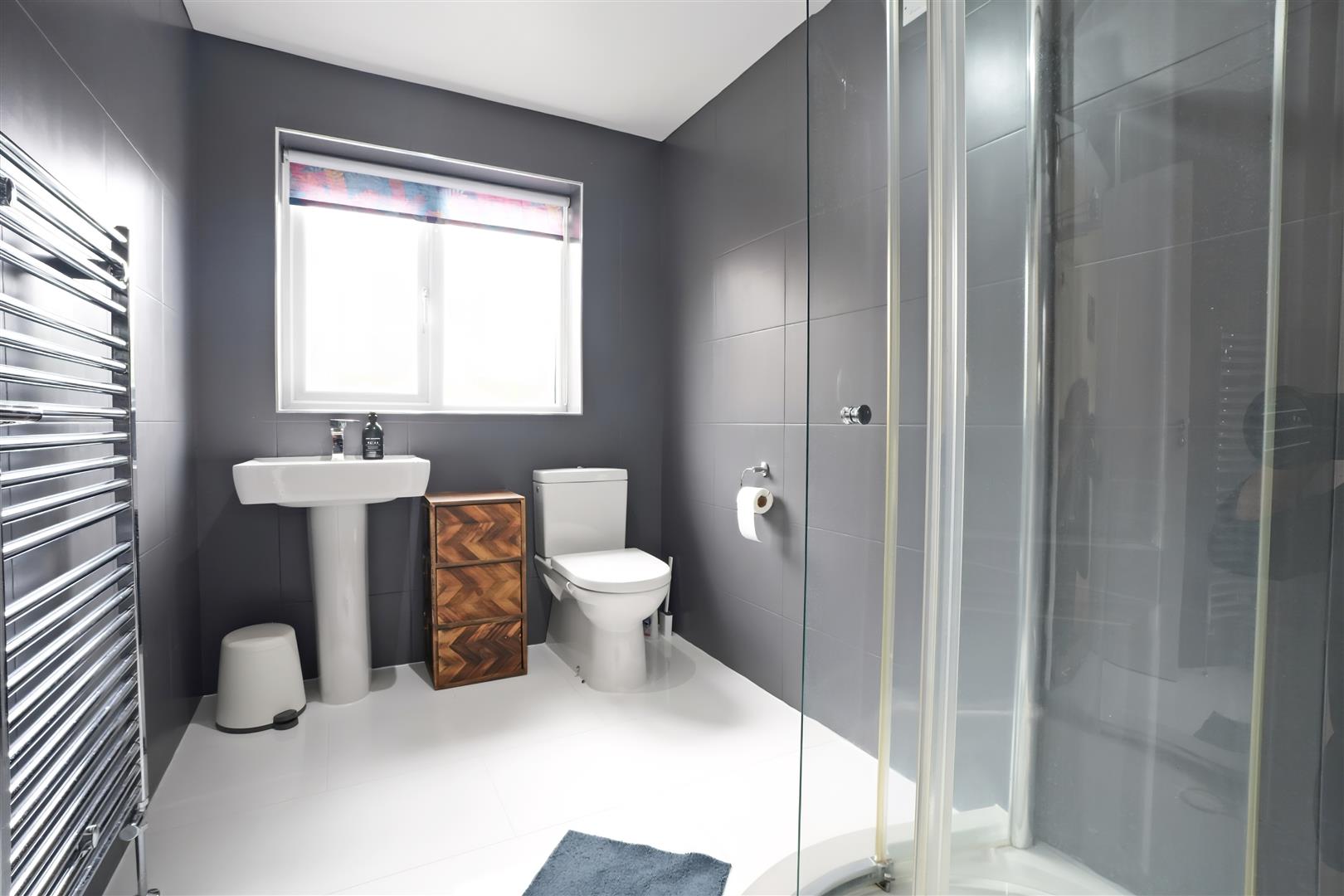 Bathroom - Modern four piece shower suite comprising bath with mixer taps, shower cubicle, wash hand basin and WC. Fully tiled. Chrome towel radiator. UPVC double glazed window to side elevation