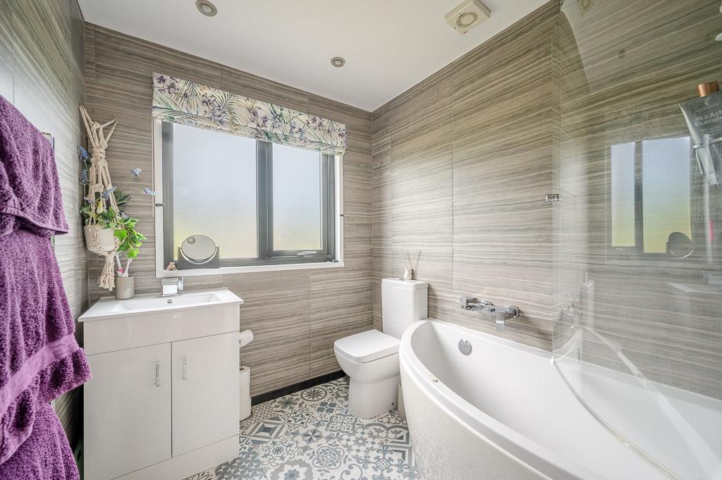 Bathroom: - () - With contemporary white suite comprising low flush WC, vanity unit, chrome mixer taps, cupboards below, corner panelled bath, wall mounted chrome mixer taps, glazed shower screen, electric shower unit, fully tiled walls, recessed LED spotlighting, extractor fan.