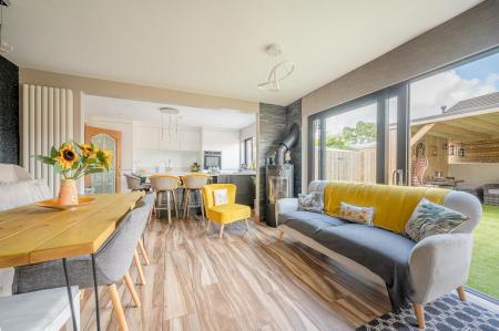 Kitchen / Dining / Living Space: - (9.4m x 4.01m) - Recent installed in handless gloss off-white and dark grey units, quartz work surface and upstand, inset ceramic sink unit with Quooker boiling tap, built-in pantry cupboards, integrated dishwasher, integrated fridge freezer, integrated Neff double oven, peninsula unit with quartz work surface, integrated four ring Bosch induction hob and extractor fan, casual dining breakfast bar, ceramic tiled floor throughout kitchen and living/dining space, uPVC sliding patio doors to rear enclosed garden, flu installed with space for wood burning stove, sliding doors to playroom/family room with mature outlook and dual aspect to rear and uPVC double glazed French doors to side.