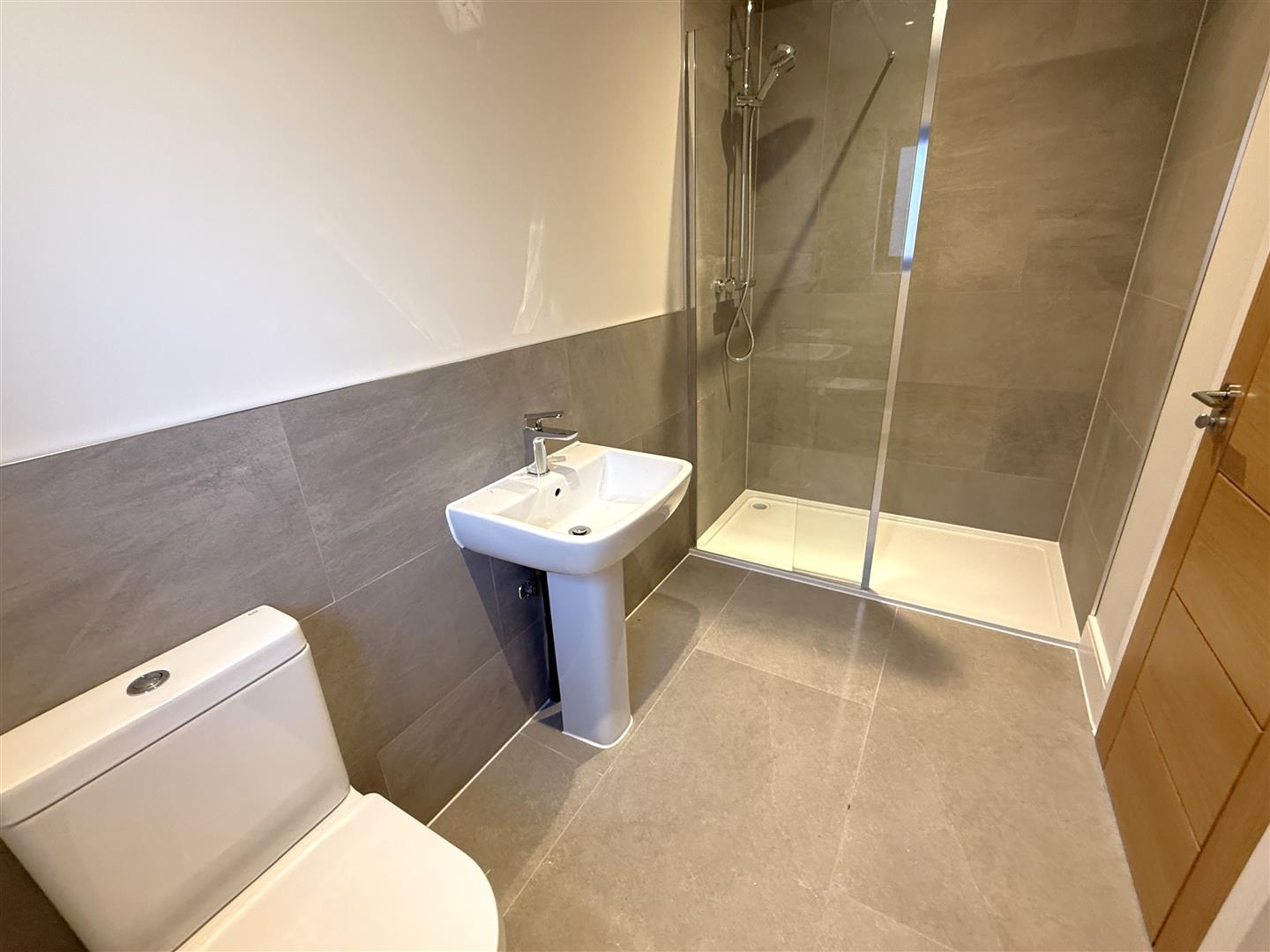 Ensuite Shower Room - 2.51m x 1.52m (8'3" x 5') - Having a contemporary three piece suite comprising double width shower enclosure with wall mounted shower mixer with both independent handset and rainwater rose over, close coupled WC and pedestal washbasin, contemporary towel radiator and double glazed window to the side.
