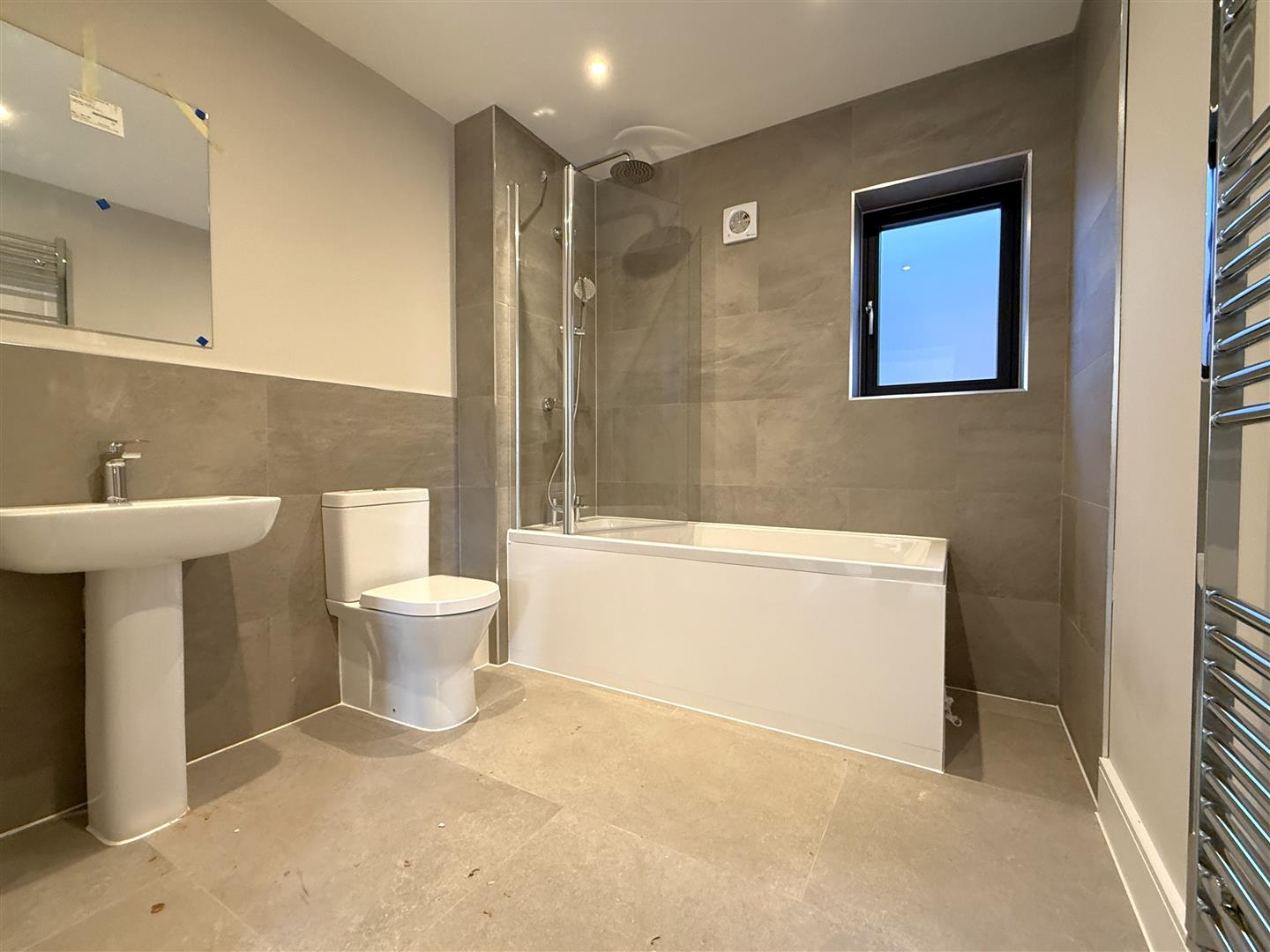 Family Bathroom - 3.15m max x 2.29m max (10'4" max x 7'6" max) - An L shaped room with contemporary suite comprising panelled bath with glass shower screen and wall mounted shower mixer with both independent handset and rainwater rose over, close coupled WC and pedestal washbasin, contemporary towel radiator, inset downlighters to the ceiling and double glazed window.