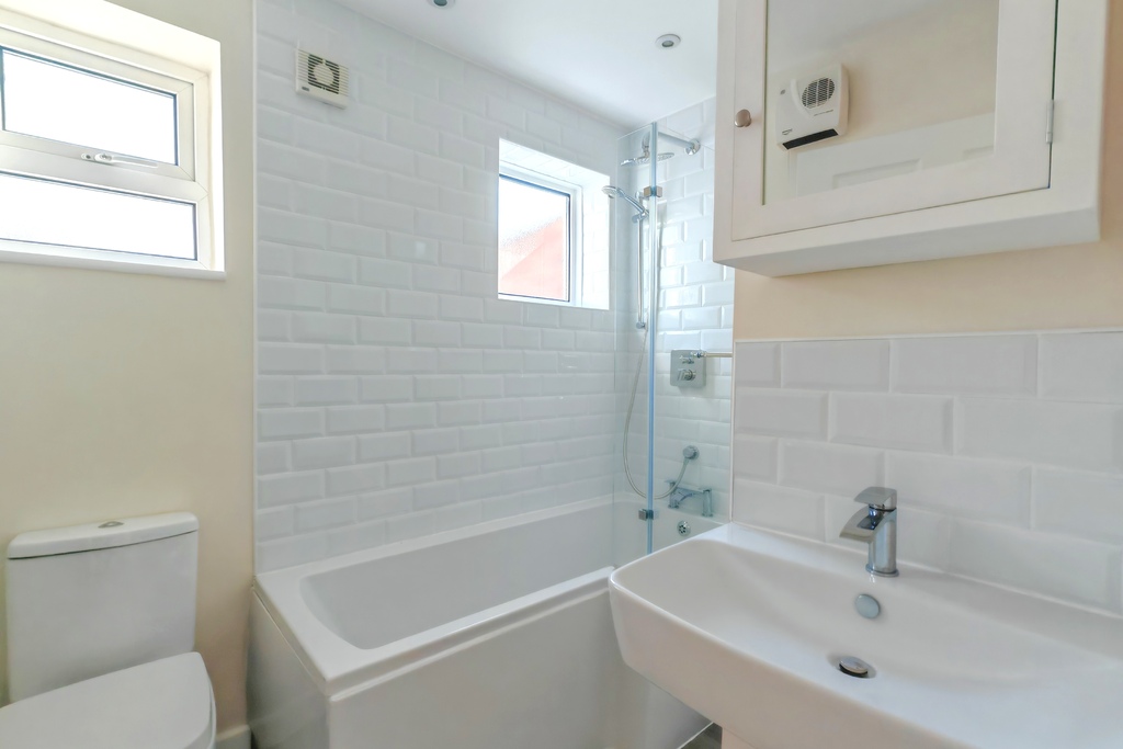 with wood effect flooring, WC, high level uPVC double glazed frosted windows, P shaped bath with rainfall shower over, separate hand attachment and glass shower screen, localised tiling, stainless steel towel radiator, hand basin with mixer taps over