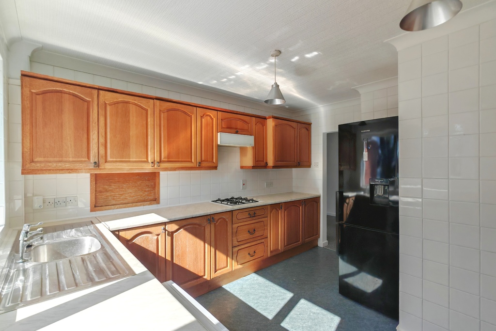 with a selection of high and low level kitchen cabinets, laminate worktops, four ring gas hob with extractor fan over, localised tiling, one bowel stainless steel sink with taps over, uPVC double glazed windows overlooking rear garden, integrated double oven, space and plumbing for slimline dishwasher, space and plumbing for washing machine