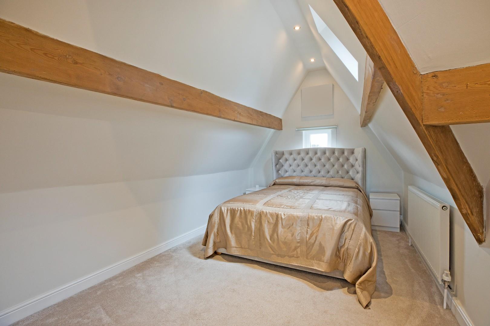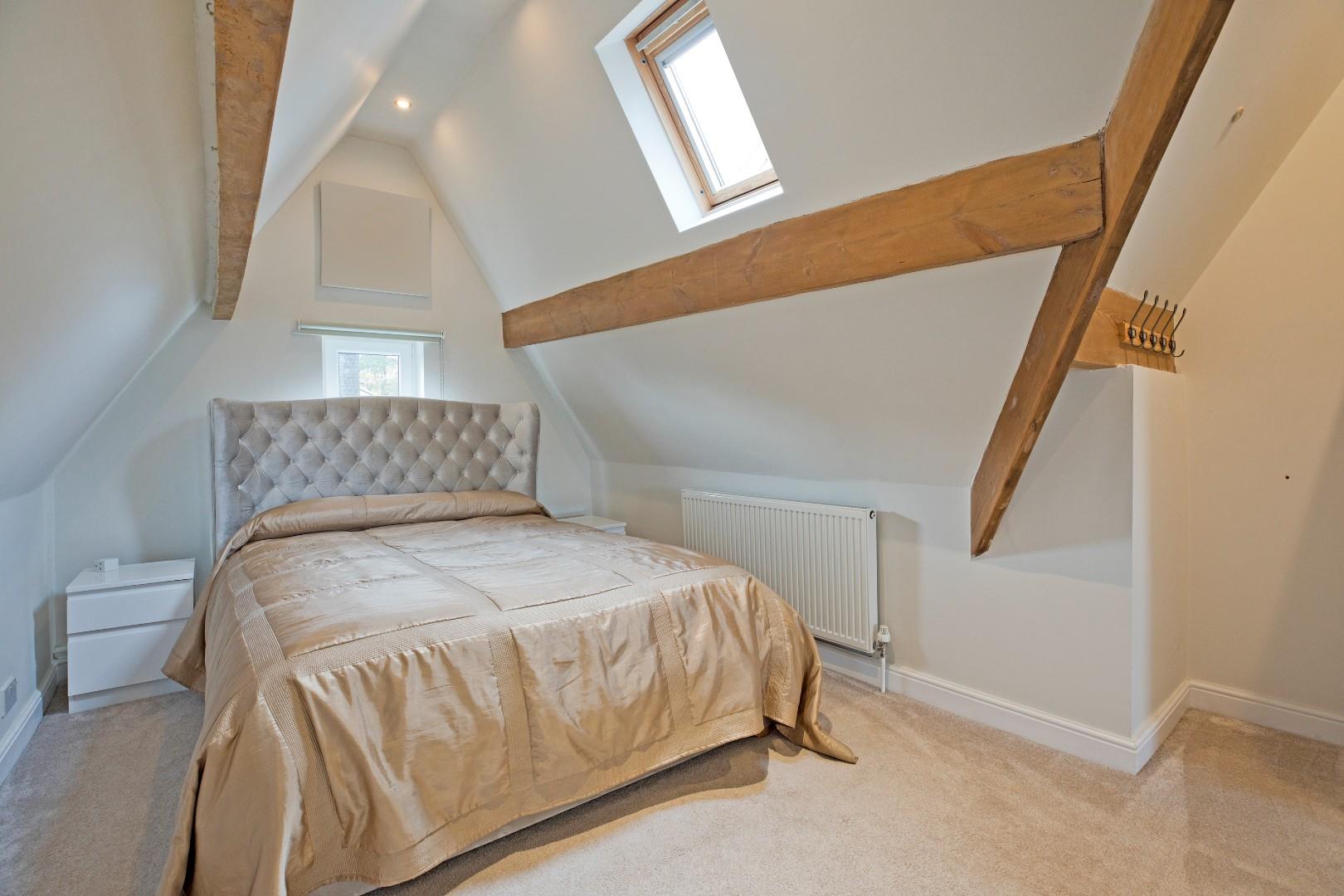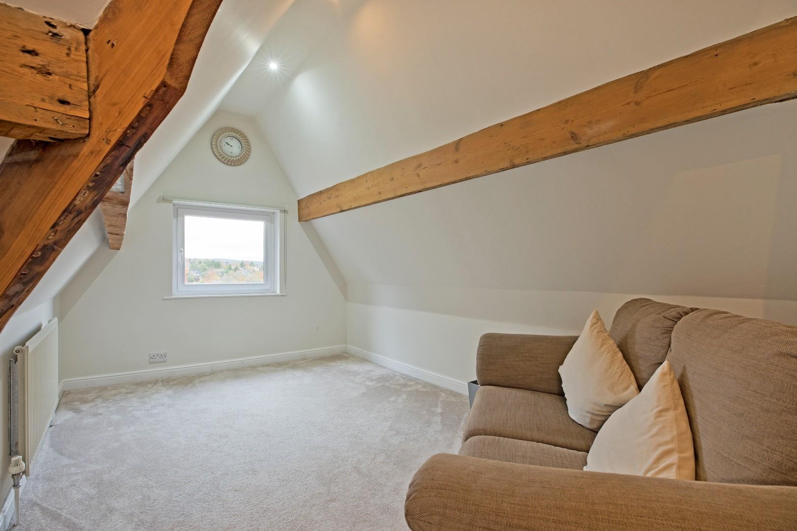 Bedroom Three - 8.84 max x 3.53 max (29'0" max x 11'6" max) - A great-sized, double bedroom with space for a living area, ideally suited to a teenager. Dual aspect windows, the larger one affording delightful far reaching views. Exposed beams lend a characterful feel. Two radiators, downlighting and carpeted flooring.