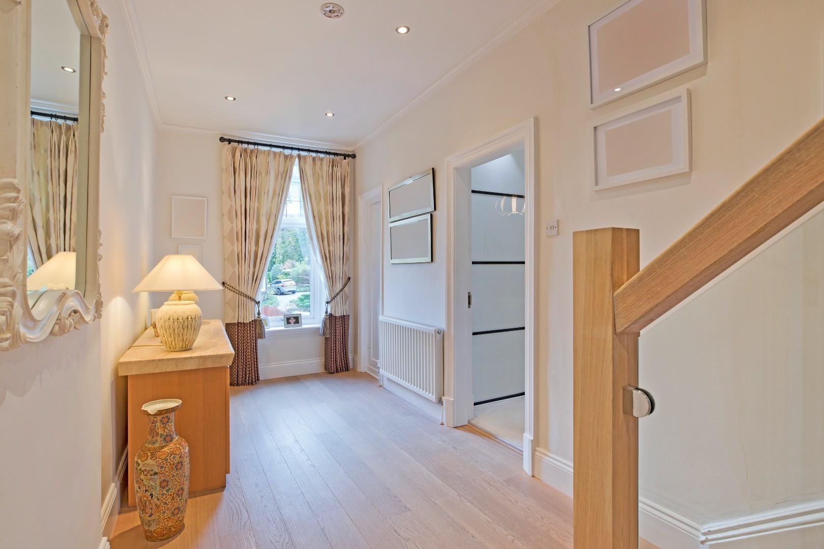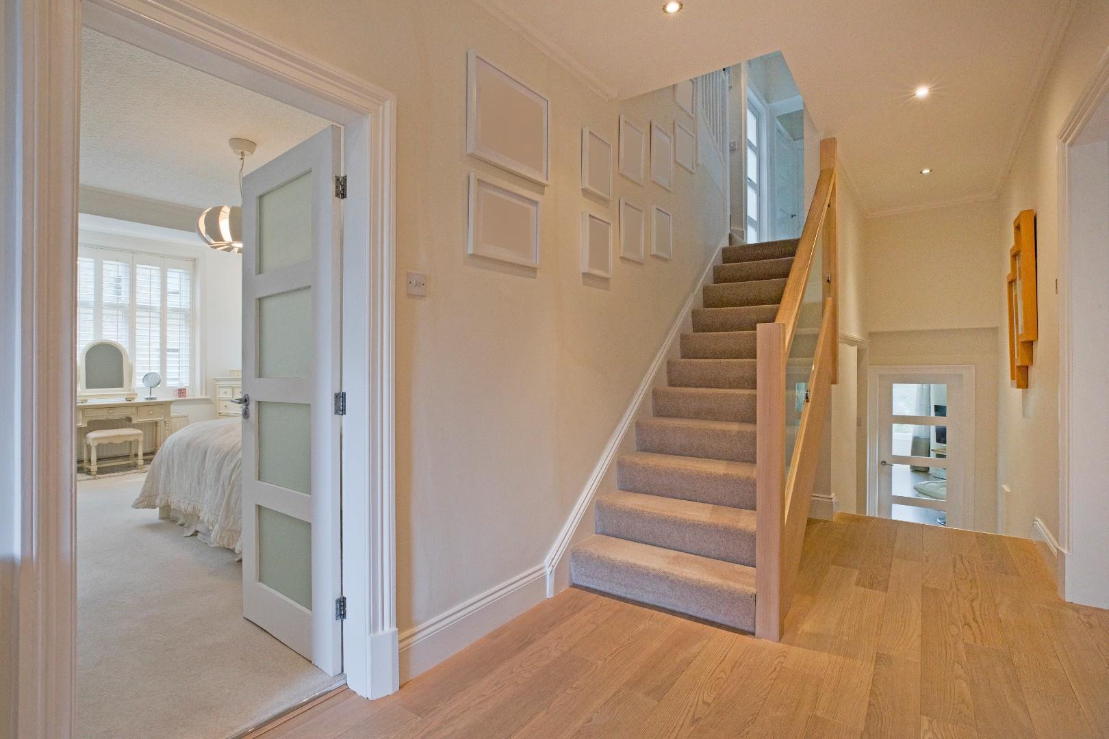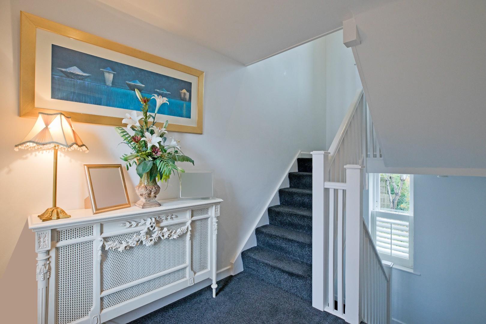 Hall - A door from the sitting room opens into a very generous hallway with space for several items of furniture. A window with shutters to the east facing elevation allows for ample natural light. Laminate flooring and radiator. A broad, carpeted staircase with stylish timber balustrade with glazed panels leads to the second floor. An understairs cupboard provides useful storage.