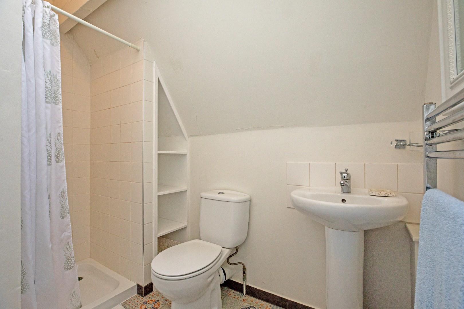 W.C. / Shower Room - This modern shower room serves Bedroom Two and comprises of a fully tiled shower cubicle, a pedestal washbasin with monobloc tap and tiled splashback and a low-level w/c. Attractive, tile effect, vinyl flooring and chrome, ladder, towel radiator. A Velux window allows natural light to flood in and glass airbricks enhance the bright atmosphere.
