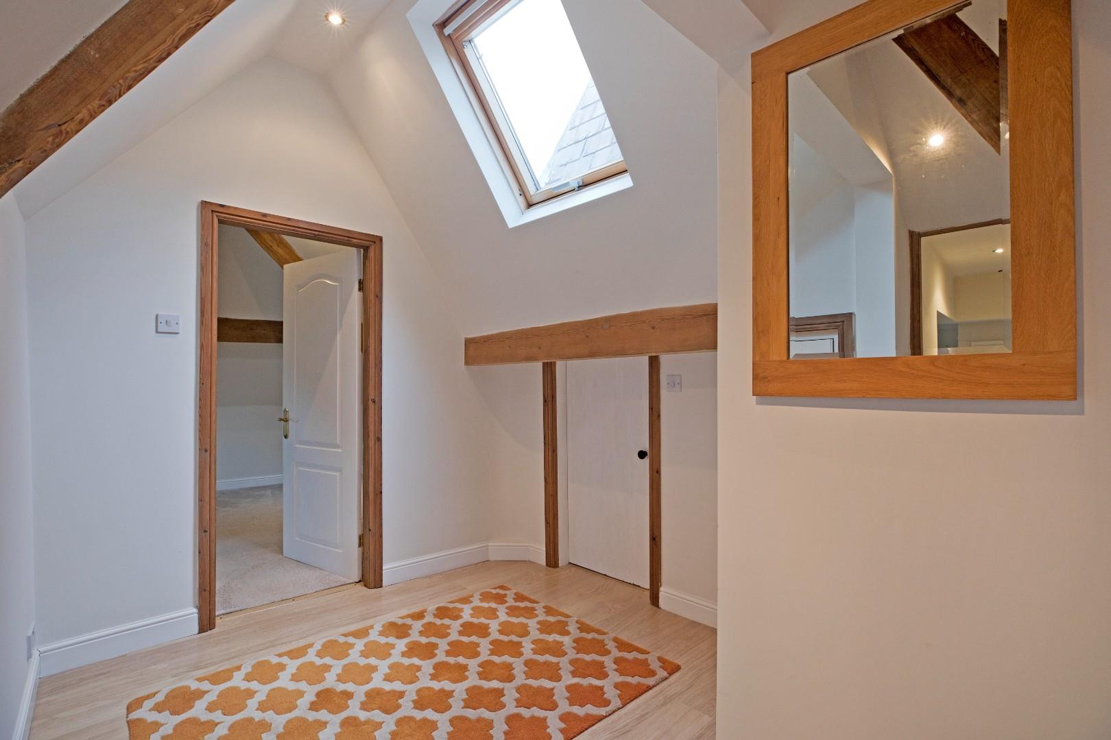 Landing - A carpeted landing leads onto a good-sized landing with laminate flooring. Exposed beam and Velux window. This property is certainly not short on storage as here we find a large under eaves cupboard, which is easily accessible.