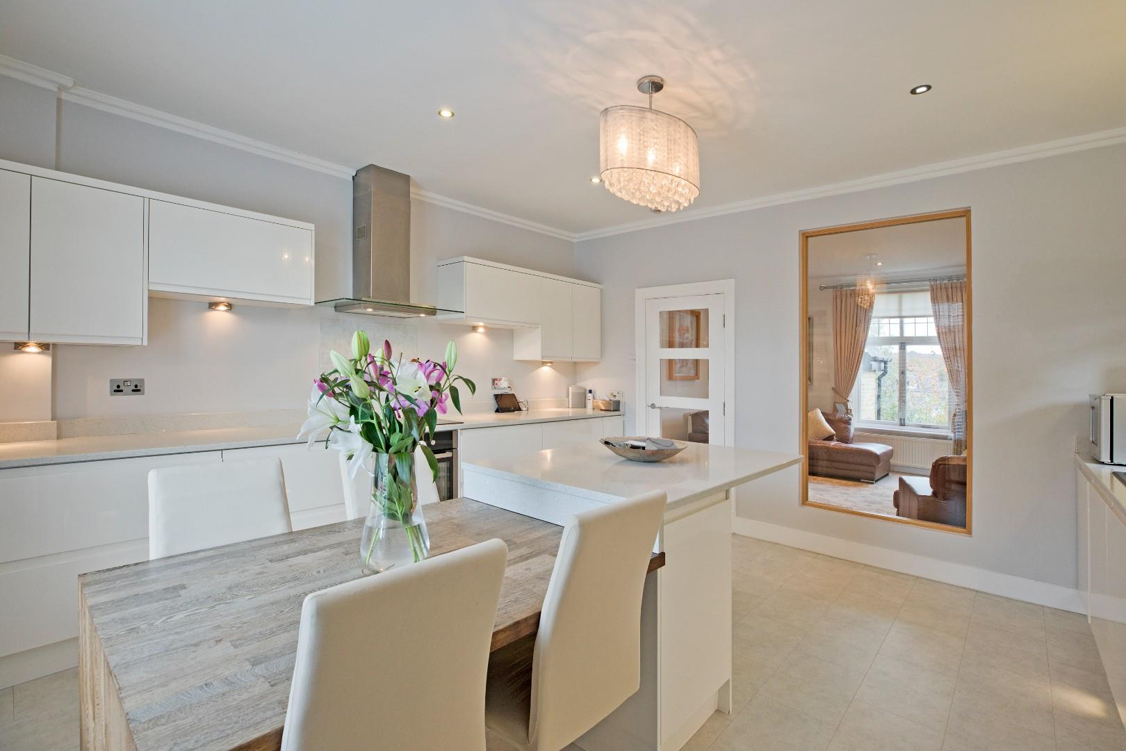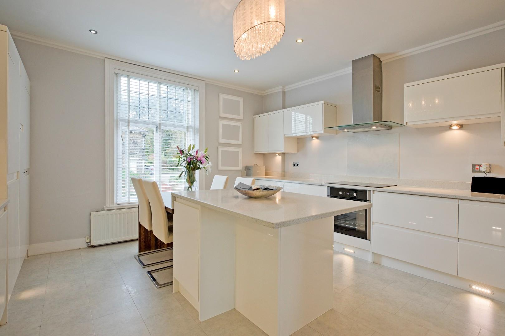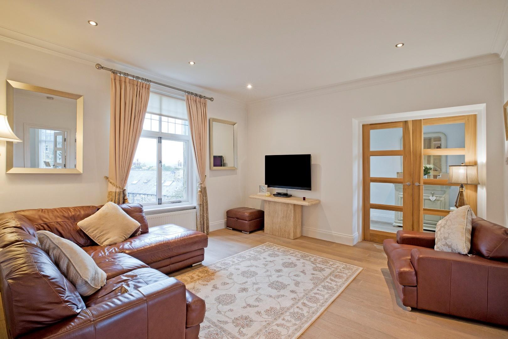 Sitting/Dining Room - 4.35 x 4.2 (14'3" x 13'9") - A lovely sitting room benefitting from generous proportions and a large window affording a delightful view over Ilkley and towards the hills in the background. Cornicing and high ceilings lend character. Laminate flooring, two radiators, downlighting and TV point. This living area creates a great-sized entertaining space with it adjoining the spacious kitchen with a tall window allowing light to flow through between these two generous rooms, creating a light and airy feel. This could also serve well as a formal dining room with ample space for comfortable seating if desired.