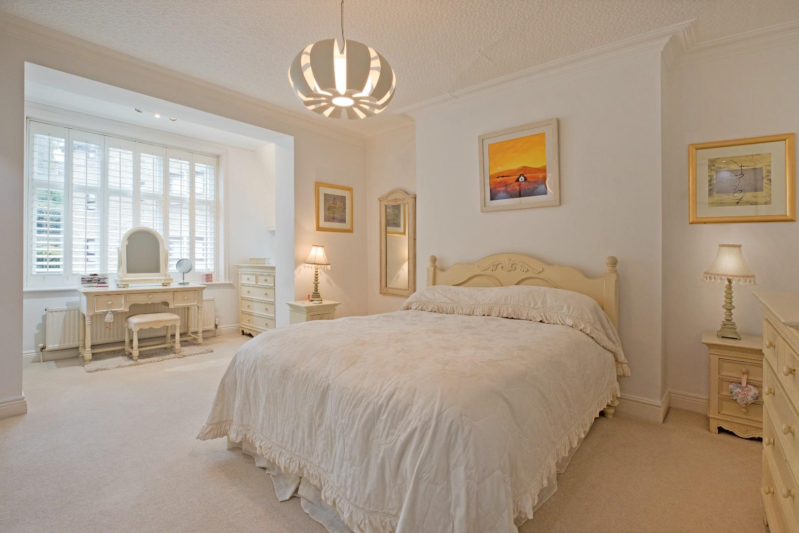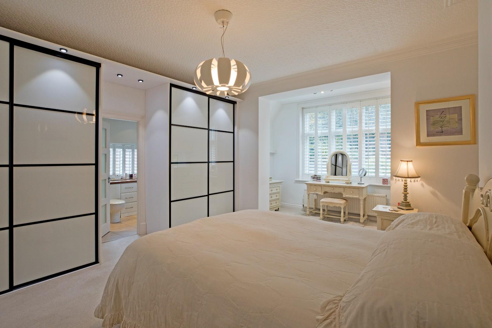 Master Bedroom - 6.10 max x 4.57 max (20'0" max x 14'11" max) - Accessed from the hallway, this superb, generously proportioned Master bedroom is a haven of peace and calm and benefits from stylish fitted wardrobes with sliding doors and a large, west facing window with shutters and a further smaller window with shutters to the front of the property. Deep cornicing, carpeting and radiator. A door opens into: