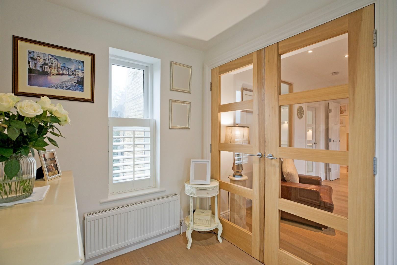 Hall - The return staircase first leads to a landing with ample natural light provided by a window on the staircase with shutters and a further window with shutters to the front elevation. Carpeting, radiator with attractive radiator cover and room for an item of furniture. The carpeted staircase continues to the first floor accommodation from which a further good-sized landing area leads into the sitting room through glazed, double doors. Window to the front elevation with shutters, radiator, laminate flooring and space for several pieces of furniture.