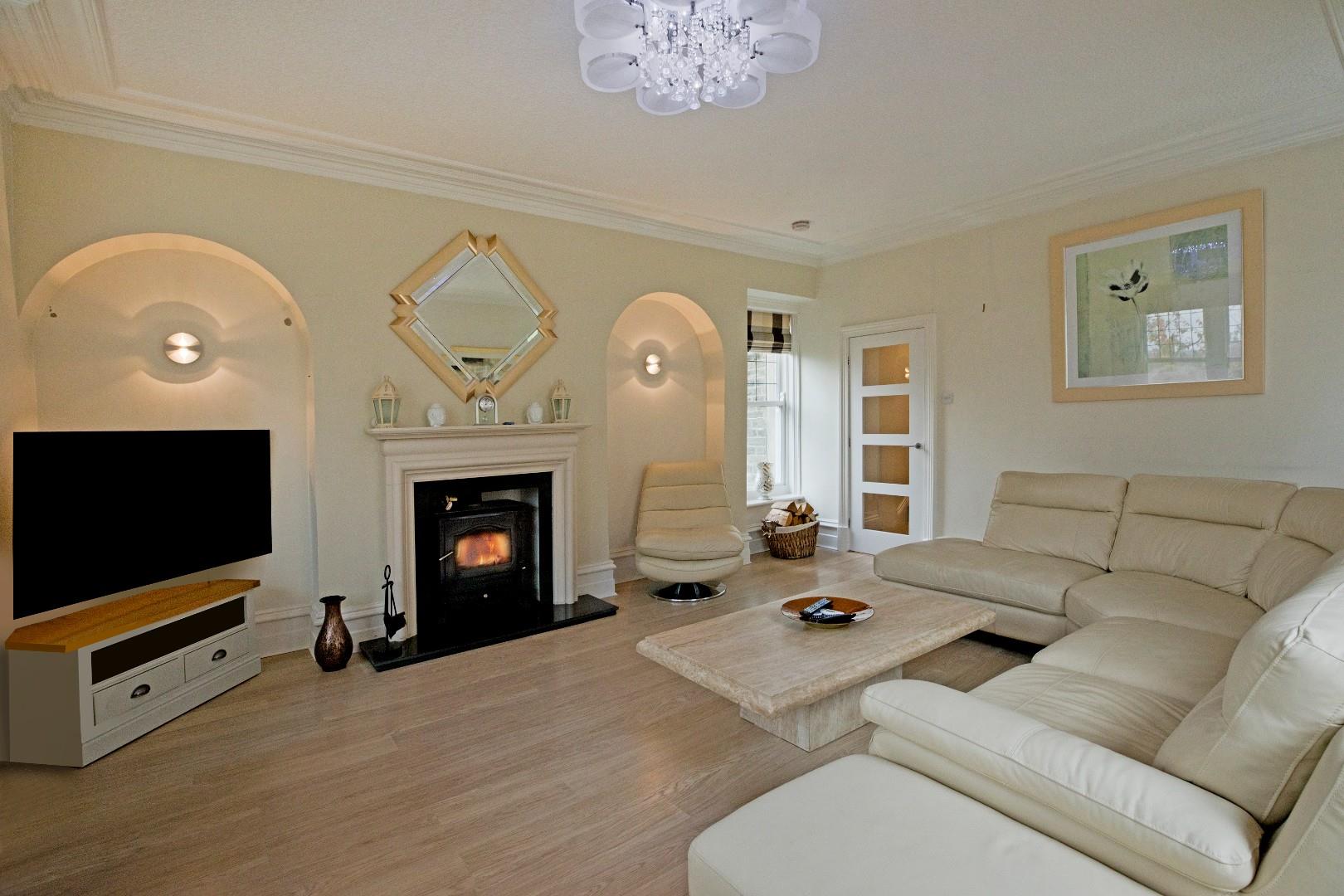Lounge - 6.71 max x 4.57 max (22'0" max x 14'11" max) - Steps lead down from the hall to a fabulous lounge of superb proportions. This well-proportioned room has an air of elegance and grandeur. Deep skirtings, cornicing and two arched alcoves continue the characterful feel. A large bay window affords breathtaking views across Ilkley towards Middleton. There are two south facing windows including one bay and a fourth window, which also affords stunning views towards Middleton. A fireplace with elegant, stone fire surround with granite hearth houses a cast iron log burning stove. Room for a sofa, armchairs and a family dining table. Laminate flooring, TV point and two radiators.
