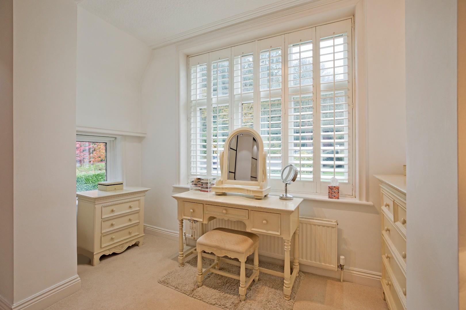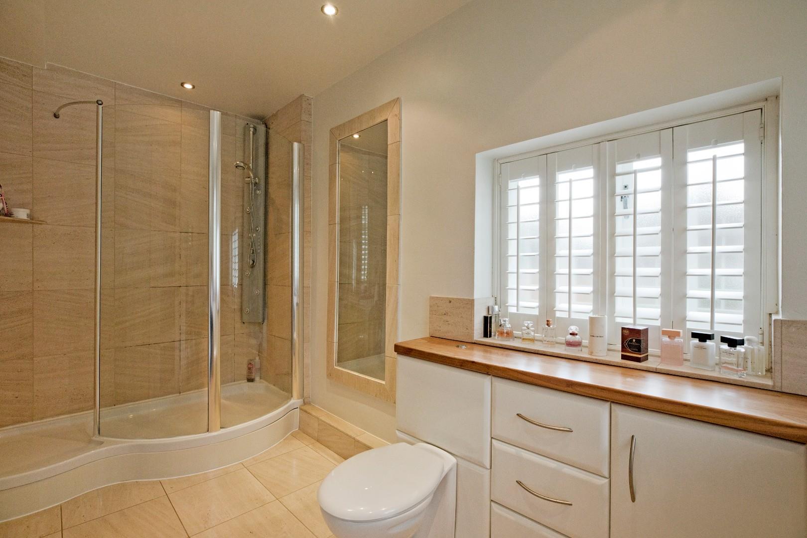En Suite Shower Room - A spacious, well-appointed en suite incorporating a large, fully tiled walk-in shower with glazed door and mains thermostatic shower, a vanity washbasin consisting of a circular basin with monobloc tap and cupboards and drawers below and a concealed cistern w/c. Dual aspect windows with fitted shutters. Tall, chrome, ladder, towel radiator, ceramic tiled floor, large, fitted, full length mirror, downlighting and extractor fan.