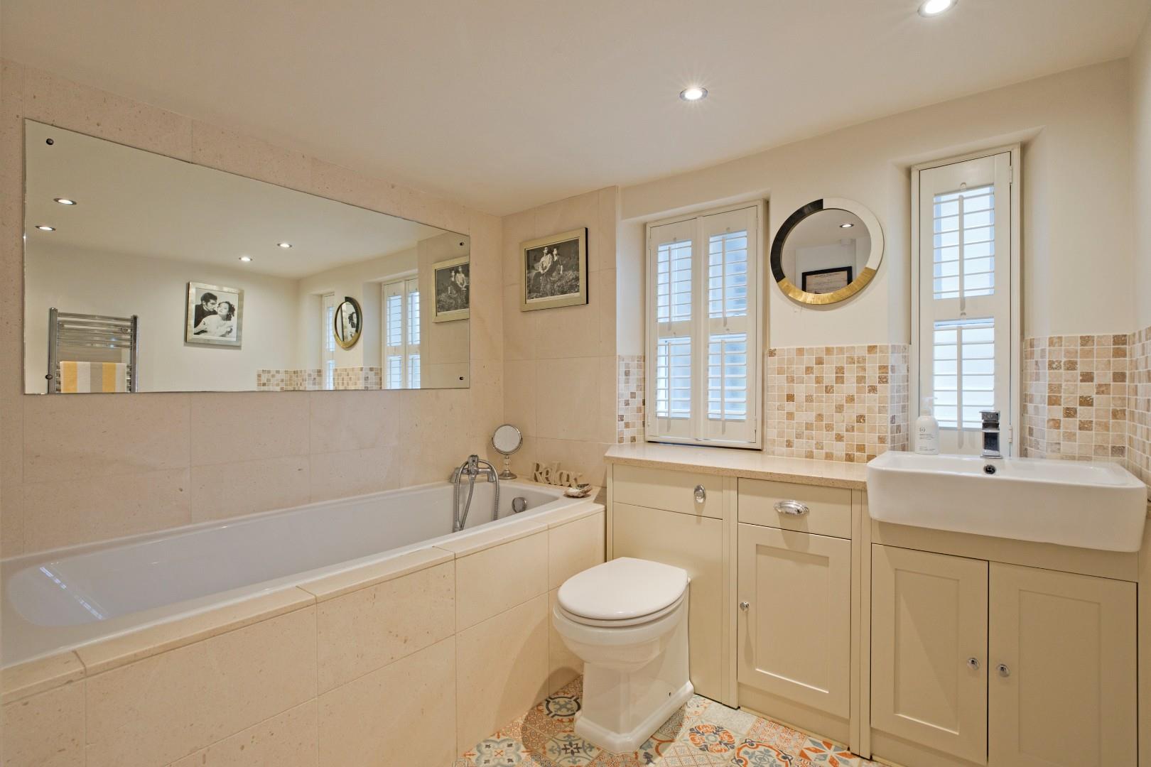 Bathroom - A modern bathroom fitted with a deep fill bath with mixer tap and hand held shower attachment, a vanity washbasin with monobloc tap and a concealed cistern w/c with pushbutton flush incorporated within a stylish unit affording a good amount of storage with mosaic effect splashback tiling. Fully tiled around the bath in large, neutral tiles. Attractive, complementary, tiled effect, vinyl flooring. Chrome, ladder, towel radiator, large fitted wall mirror and downlighting. Two windows with shutters allow for ample natural light.
