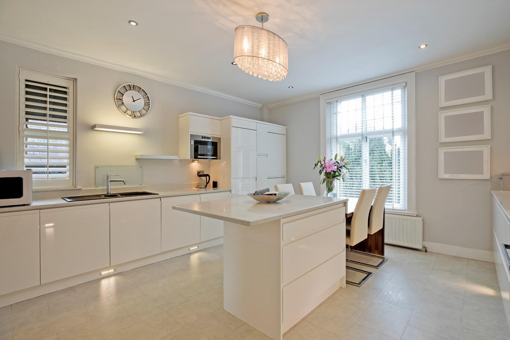 Breakfast Kitchen - 4.5 x 4.35 (14'9" x 14'3") - A beautifully appointed, modern kitchen fitted with contemporary base and wall units providing an abundance of storage with quartz worksurface and upstands over. Integrated appliances include an electric oven with induction hob, glass splashback and stainless-steel chimney hood and extractor over, microwave, dishwasher, fridge/freezer and a washing machine/tumble drier. Composite one and a half bowl sink with drainer, monobloc tap and glass splashback, under unit lighting, under pelmet lighting and downlighting. Karndean flooring, cornicing and radiator. This is a wonderful environment in which to enjoy mealtimes with family or to entertain. A large island with breakfast bar is a great spot to sit and enjoy a coffee and there is also room for a dining table should one so wish. A cupboard houses the central heating boiler. Dual aspect windows make for a bright atmosphere. Planning permission was previously granted for a Juliet balcony, which has now lapsed.