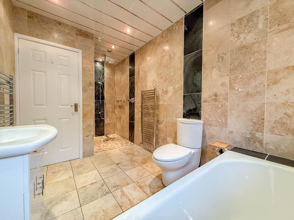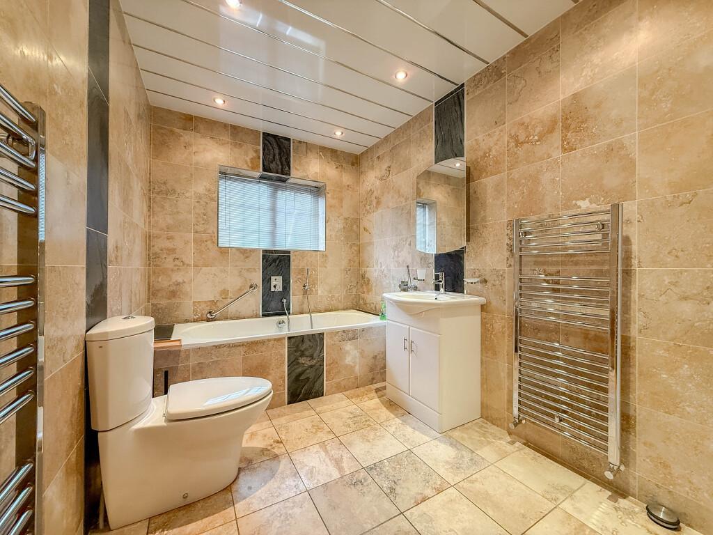 Freshly redecorated throughout, the layout includes a generous entrance hall, a principal bedroom with a compact en-suite WC and fitted furniture, a spacious lounge with a feature fireplace, two further bedrooms, a dining room, a garden room, and a stylish four-piece family bathroom. The well-propertioned kitchen is supported by a separate utility room.