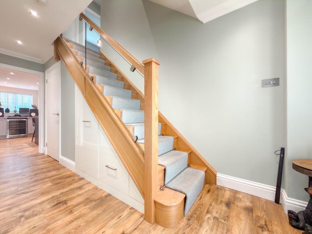 The welcoming entrance hallway sets the tone for the home, featuring a bespoke oak staircase with built-in storage cupboards and an impressive re-fitted WC.